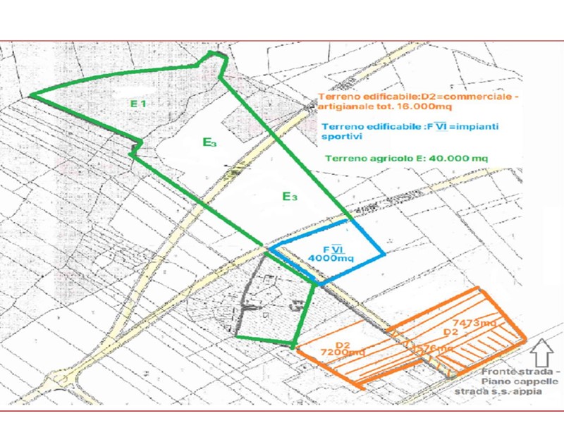 A pochissimi metri dal centro città in località Piano Cappelle lungo S.S Appia zona ad elevata visibilità e in forte sviluppo commerciale, APPEZZAMENTO DI COMPLESSIVI 63000 mq di cui 18000 mq Edificabili a destinazione commerciale/artigianale (D2) e 4000 mq a F6 (impianti sportivi). I restanti 40000 mq sono a destinazione agricola con differenti caratteristiche edificatorie e varie. Tratt. Riservata