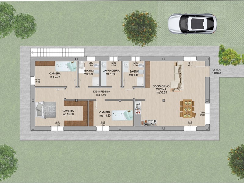 Le costruzioni saranno realizzate unicamente in bioedilizia, tenendo conto delle caratteristiche del territorio, utilizzando il legno per la struttura portante e blocchi in canapa per la tamponatura esterna. La canapa ha contemporaneamente funzione di tamponamento, isolante termico, isolante acustico e regolazione dell'umidità interna, garantendo salute e comfort delle persone che ci abiteranno. Gli impianti utilizzano solo fonti di energia rinnovabile (fotovoltaico e solare termico). La villetta può essere progettata e realizzata in base alle specifiche esigenze del cliente variando i metri abitabili e gli spazi accessori, studiando la funzionalità degli ambienti a seconda del personale modo di vivere la casa.