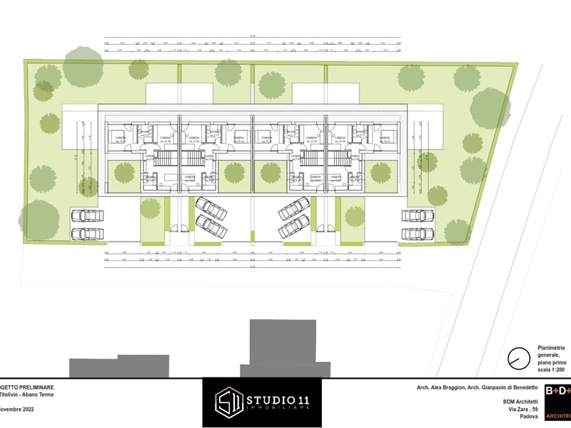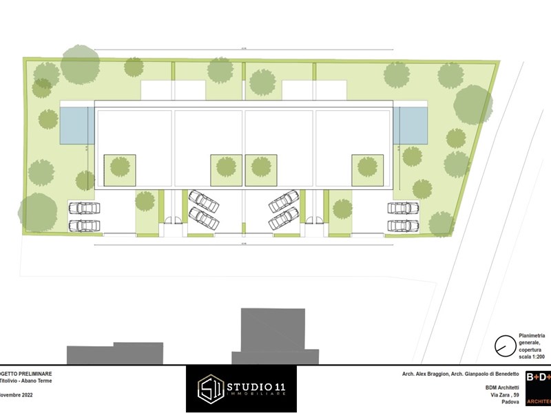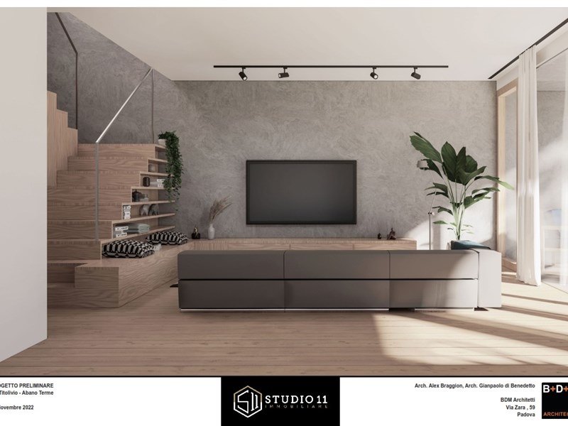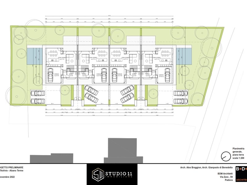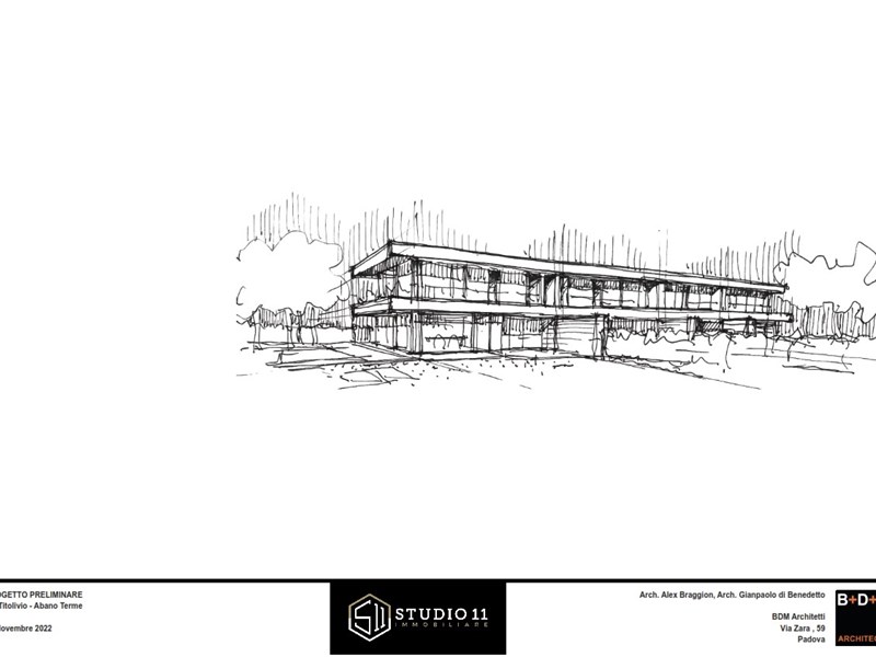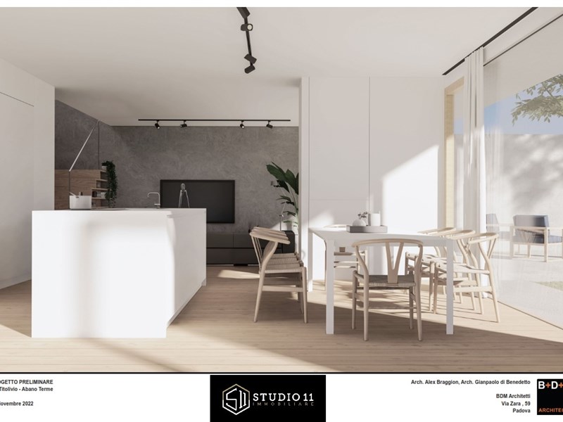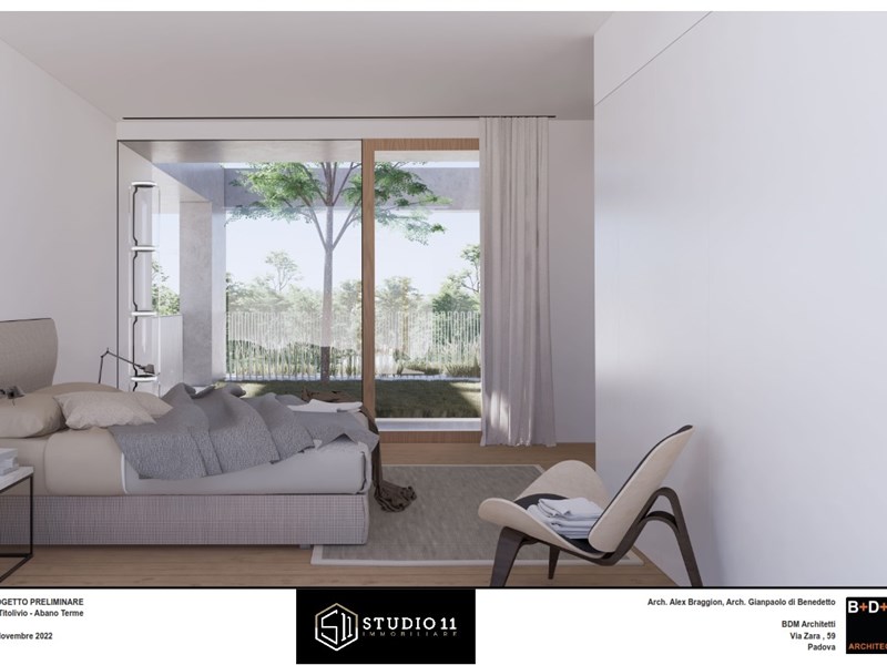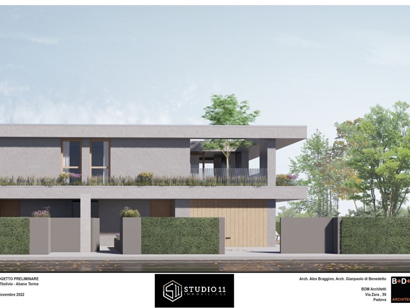 Proponiamo innovativa porzione di testa con ampio scoperto privato di oltre 420mq, l'unità s'inserisce in un contesto di quattro ville dal marcato design contemporaneo, di evidente ispirazione nordica il corpo di fabbrica si distingue per le linee pulite e minimaliste, impreziosite da ampie pareti vetrate che suggeriscono soluzioni stilistiche inconsuete nel panorama delle nuove costruzioni edili all'interno della zona termale. Gli accessi danno ad un ingresso pedonale ed un carradio con ampio spazio di manovra, due comodi posti auto esterni ed un garage doppio in larghezza. Il pedonale genera un percorso riparato sino alla zona ingresso ben definita, la stessa da accesso distributivo al salone principale, al vano scala, al servizio ospiti ed al garage. Il salone centrale si caratterizza da ampie pareti