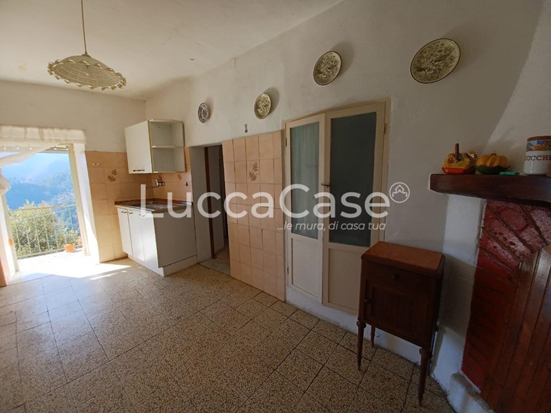 L’ingresso ci conduce a destra in due ampie stanze e a sinistra in una camera il cui balcone stretto e lungo che potrebbe ospitare un piccolo tavolo e due sedie, si affaccia su un panorama mozzafiato dovuto alla lussureggiante natura. Lo stesso panorama si gode dalla cucina abitabile arricchita da un camino, una stufa e una generosa dispensa. Un salone – anch’esso affacciato sul panorama, un piccolo bagno e una cantina completano la casa. Da una botola sita a fianco della porta del bagno si giunge ad una stanza ampia quanto il salone.