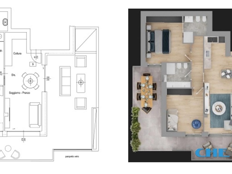 Proponiamo in vendita in nuova costruzione contesto signorile in posizione invidiabile dotata delle migliori tecnologie per il risparmio energetico e l'isolamento acustico, appartamento al piano secondo, composto da ingresso soggiorno con cucina a vista, 2 camere matrimoniali, 2 bagni, ampio terrazzo dove poter sfruttarlo per pranzi e cena all' aperto. Possibilità di personalizzare gli interni a proprio gusto. Non compreso nel prezzo il garage. Detrazione sisma bonus Consegna fine 2022.\nPer ulteriori informazioni contattare al 0541/694306 email riccione1@che-casa.it