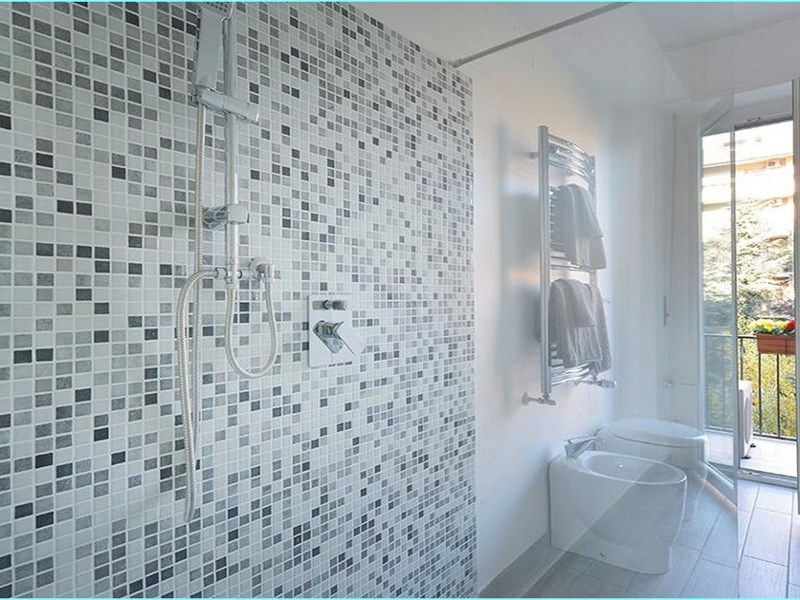 L’appartamento comprende inoltre un grande e bellissimo bagno: sia il lavandino che la spaziosissima doccia rivestita con mosaico sono dotati di effetto cascata. Dal bagno si accede ad un secondo balcone che include un tavolo per due e che affaccia anch’esso sul verde.