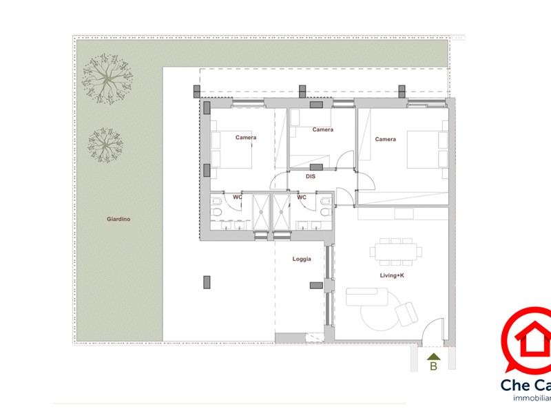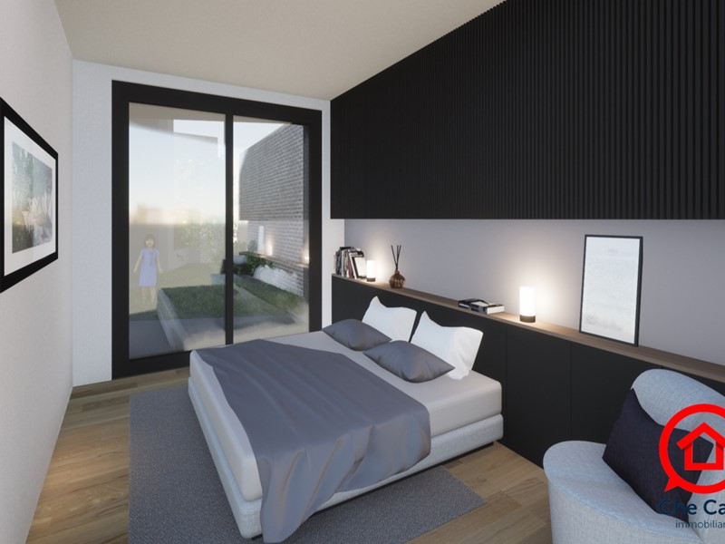 Soluzione B/piano terra : Ingresso su ampio e luminoso open space di circa 35 mq calpestabili, (possibilità di espanderla sino a 40 circa) con doppia porta finestra scorrevole che apre su loggia coperta, corte pavimentata e poi giardino privato di oltre 130 mq. Ideale per barbecue, pranzi cene e relax estivi. La zona notte, ben separata dal disimpegno offre tre camere da letto: una padronale di 20 mq calpestabili con scorrevole, una seconda matrimoniale ed una singola. Due bagni finestrati servono la casa. Ogni camera da letto ha libero accesso sul giardino. La soluzione è libera ed ha spazio esterno privato su tre lati. Si completa di garage.