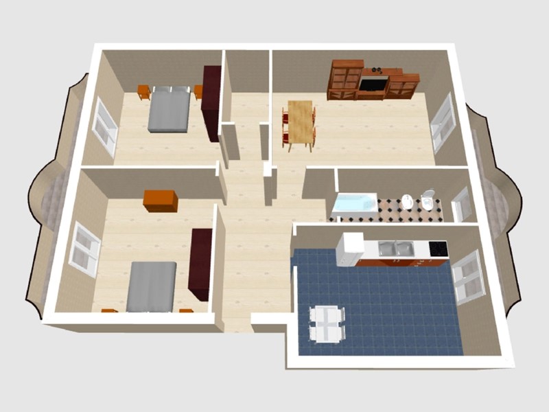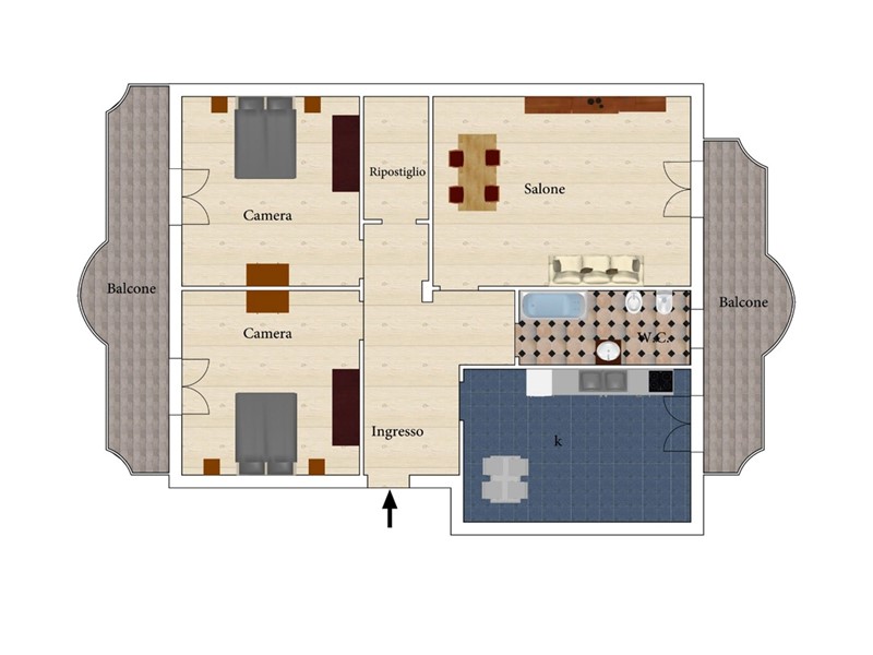 L' immobile è così composto: ingresso, salone, 2 camere da letto matrimoniali, cucina abitabile, bagno e ripostiglio.