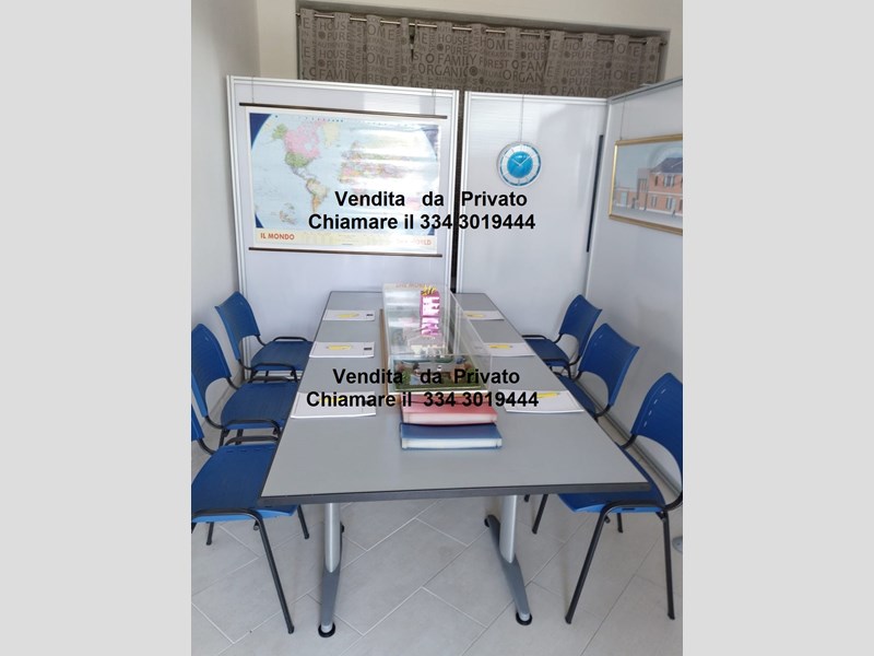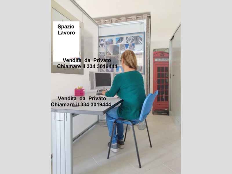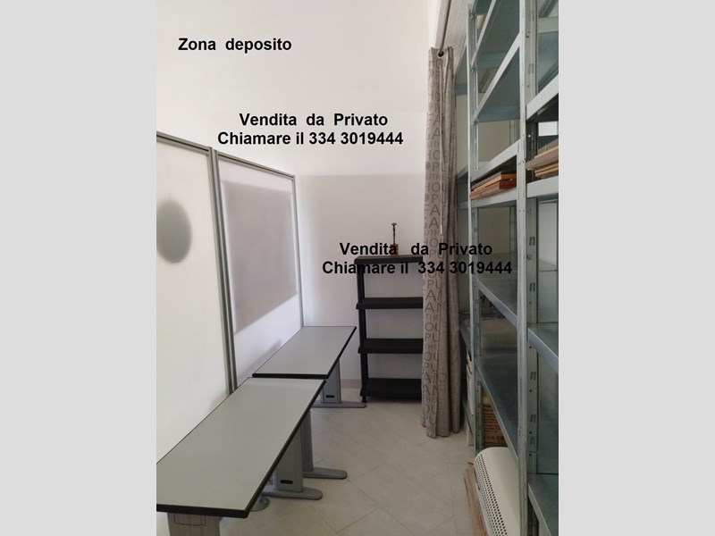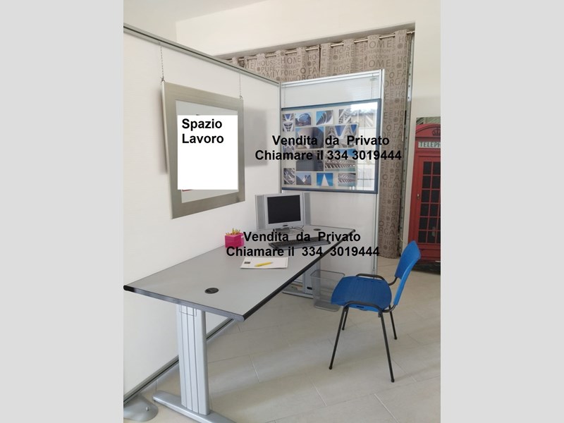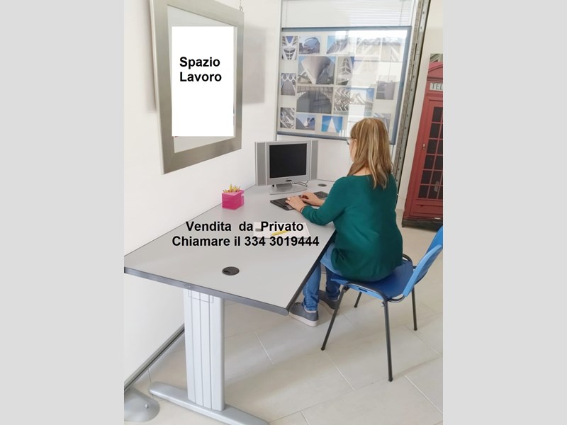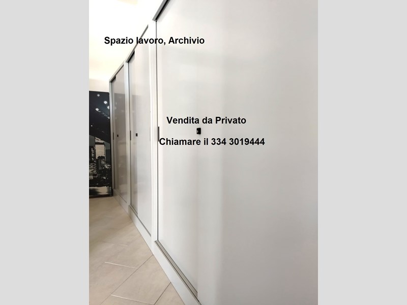 Il locale è attualmente suddiviso tramite pareti mobili nei seguenti spazi: area riunioni con tavolo e 7 sedute disponibili, spazio lavoro con ampia scrivania di 180x80 e 4 metri di armadiature archivio, zona deposito multiuso con profonda scaffalatura a parete e due scrivanie di appoggio.