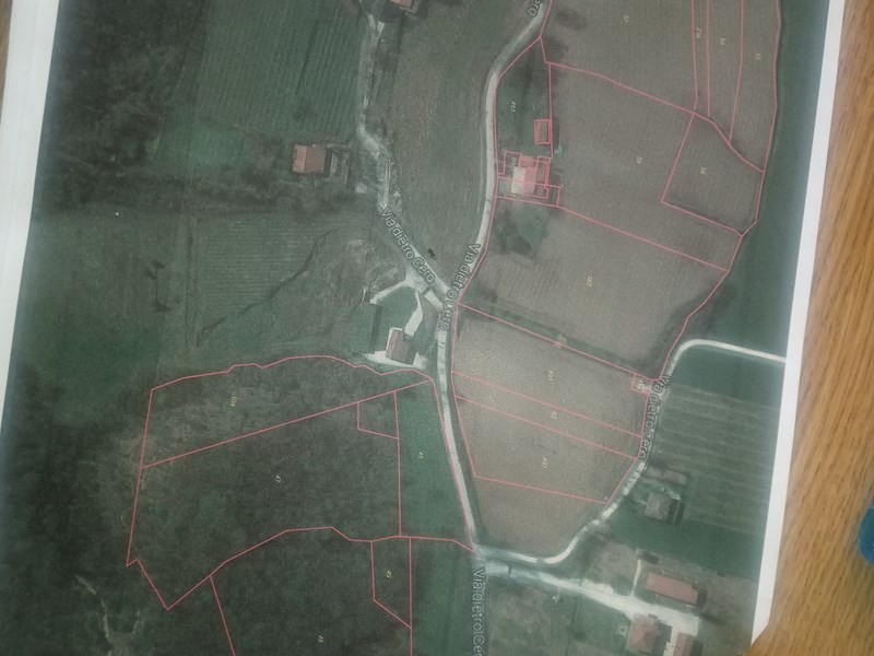 I circostanti Terreni sono costituiti da BOSCO ceduo misto (rovere, frassino e carpino) per 26.000mq SEMINATIVI per 38.000mq (ora in produzione a erba medica) e un VIGNETO fronte strada di mq 2724 in attuale produzione. I terreni adiacenti agli edifici sono in OTTIMA posizione, tutta pianeggiante, di facile lavorazione ed essendo al centro della vallata godono di fertilità agraria anche con possibilità di moderni allacciamenti irrigui.