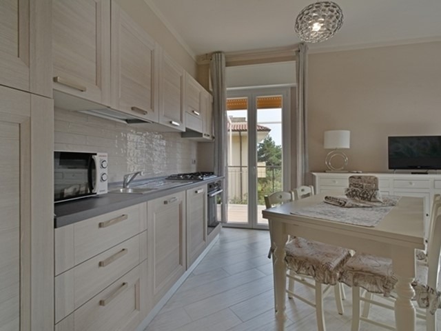 bagno con doccia e finestra ampio salone con salotto e angolo cottura attrezzato con lavastoviglie, frigo con congelatore, microonde, tv color e lavatrice.