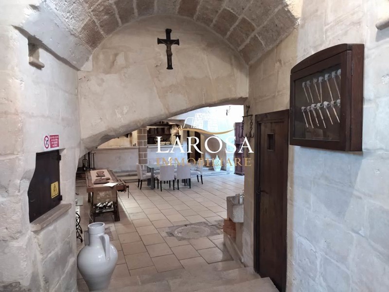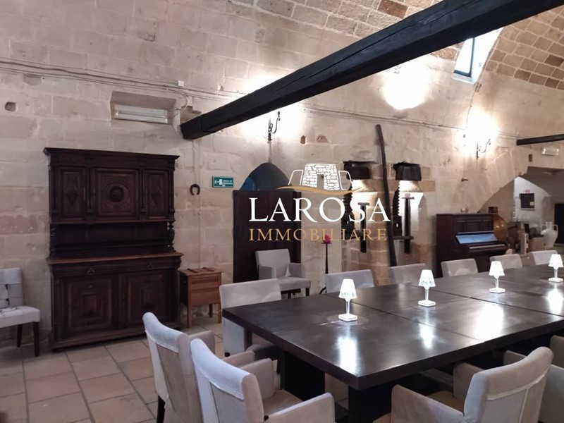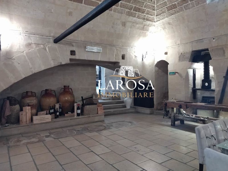 LA STRUTTURA PIU’ IMPORTANTE RICOMPRESA NEL LOTTO E’ IL RISTORNATE/PIZZERIA UBICATO AL PIANO SEMINTERRATO, SEDE DI UN ANTICO FRANTOIO IPOGEO (SOTTERRANEO), TIPICA STRUTTURA SALENTINA DEL 600’ ADIBITA NEL PASSATO ALLA PRODUZIONE DELL’OLIO LAMPANTE, ATTRAVERSO LA MOLITURA DELLE OLIVE CON ANTICHE MACINE IN PIETRA ED ESTRAZIONE DELL’OLIO MEDIANTE ANTICHI TORCHI A VITE IN LEGNO. AL LOCALE SI ACCEDE DALL’INGRESSO POSTO AL PIANO STRADA SU VIA XX SETTEMBRE, SCENDENDO LA SUGGESTIVA SCALA IN PIETRA SINO AL PIANO INTERRATO, POSTO CIRCA 5 MT SOTTO IL LIVELLO STRADALE. QUI TROVIAMO L’IMPONENTE STRUTTURA IPOGEA COMPOSTA DA 2 AMPIE SALE ADIBITE A RISTORANTE, ALTRE PICCOLE SALETTE, TUTTE CON FOCOLARE A LEGNA E TIPICHE VOLTE A BOTTE O A STELLA IN PIETRA DI CARPARO A VISTA, MENTRE I MURI, SCAVATI NELLA ROCCIA, SONO RIVESTITI DA MURATURA IN PIETRA LECCESE, MENTRE LA PAVIMENTAZIONE E’ REALIZZATA IN CHIANCA ANTICATA IN PIETRA LECCESE. TUTT’INTORNO ALLE 2 AMPIE SALE E SALETTE TROVANO COLLOCAZIONE DIVERSI VANI ACCESSORI TRA CUI I SERVIZI IGIENICI PER LA CLIENTELA, LE USCITE DI SICUREZZA, UN SUGGESTIVO ANGOLO BAR CON ARCO IN PIETRA, IL GUARDAROBA, PICCOLI LOCALI DEPOSITI, INFINE L’AMPIA CUCINA CON SOLAIO, ALLA QUALE SONO COLLEGATI I RELATIVI VANI TECNICI, TRA CUI LE CELLE FRIGO, GLI INGRESSI PER L’ESTERNO, WC E SCOPERTO ESTERNO CON ACCESSO DA VIA XX SETTEMBRE E PEDONALE SU VIA G. MAZZINI./