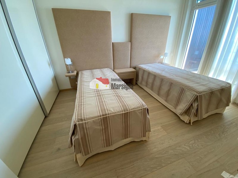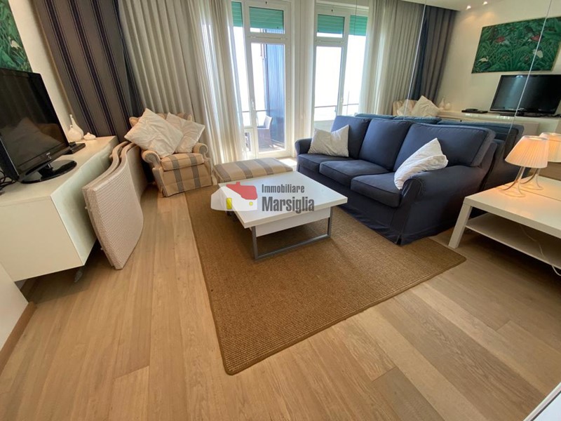 In complesso signorile con portineria, piscina e spiaggia privata, vendiamo appartamento al secondo piano con ascensore con ampio balcone fronte mare.