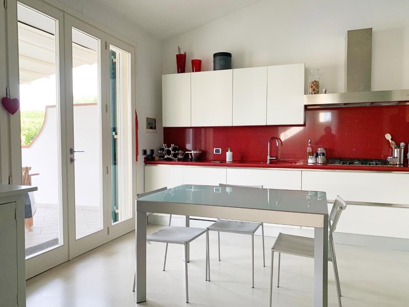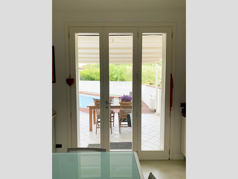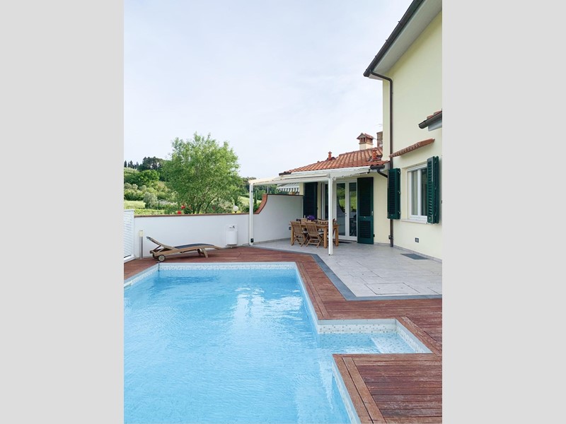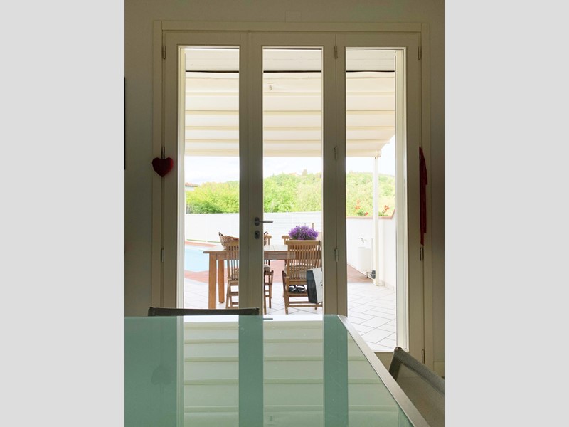 Composta al piano terra da ampio soggiorno, un servizio igienico con finestra, una cucina abitabile che presenta un’ampia apertura con bella porta in cristallo per il collegamento con il soggiorno. Nella cucina è presente anche una grande porta finestra che introduce alla piscina privata con una vista “da cartolina”, incorniciata dallo sfondo sulle colline circostanti;