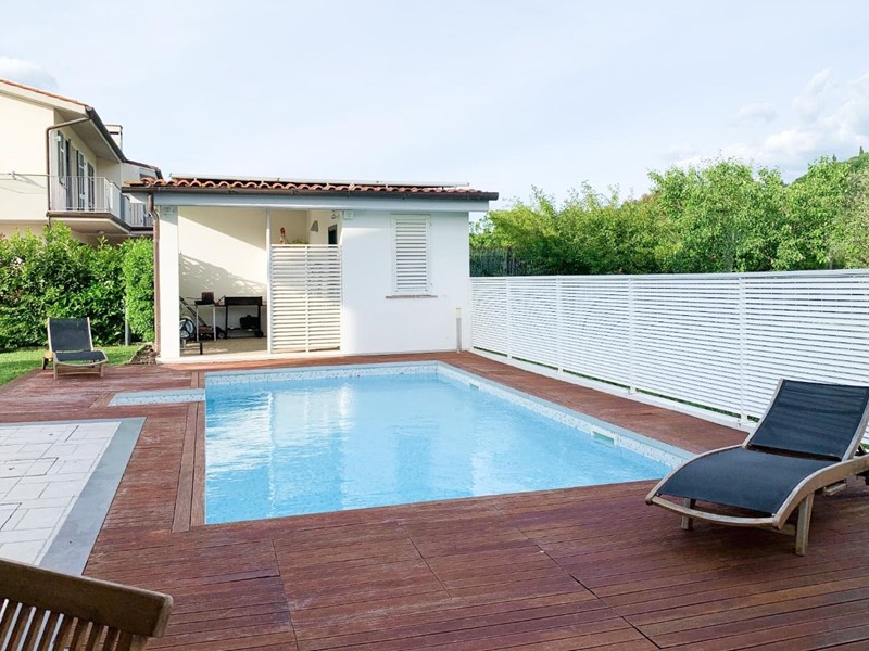 La casa è stata costruita nel 2003 ed è parte di una villetta bifamiliare posta in un contesto esclusivo e silenzioso, lo spazio esterno è sui 3 lati dell’immobile e sono circa 300 mq suddivisi in verde giardino ed in parte pavimentati ed utilizzati anche come posti auto, accessibili dal cancello carrabile elettronico. La piscina è in muratura e rivestita a mosaico, abbiamo i pannelli fotovoltaici per la produzione di energia elettrica, nella zona giorno pavimentazione in resina e nella zona notte parquet, riscaldamento a pavimento ed impianto aria condizionata, impianto di allarme, addolcitore acque, aspirapolvere centralizzato.