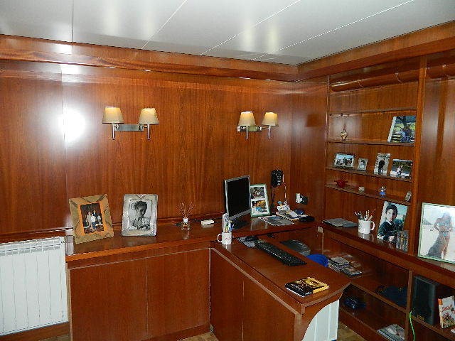 Piano inferiore (taverna): accogliente salotto, zona studio, secondo bagno con doccia e accesso diretto al garage.