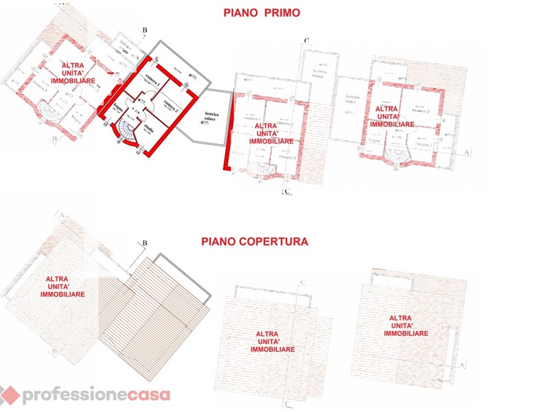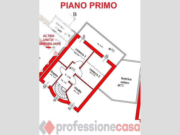 Da una scala angolare progettata con criterio, si accede al piano superiore, piano primo, dove troviamo, corridoio, due camere ognuna con accesso su balcone, studio (3 Camera), bagno finestrato.