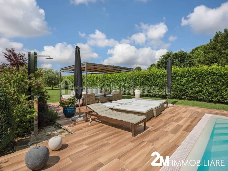 Il giardino di 1900 mq. è completamente cintato e si trova una piscina interrata realizzata nel 2019. Sono presenti l'impianto Fotovoltaico, l'addolcitore, l'impianto di allarme volumetrico e perimetrale, l'aria condizionata, il video citofono, le inferriate in tutta la casa, il pozzo artesiano, l'impianto di irrigazione a pavimento intorno alla piscina, l'illuminazione e due gazebo .