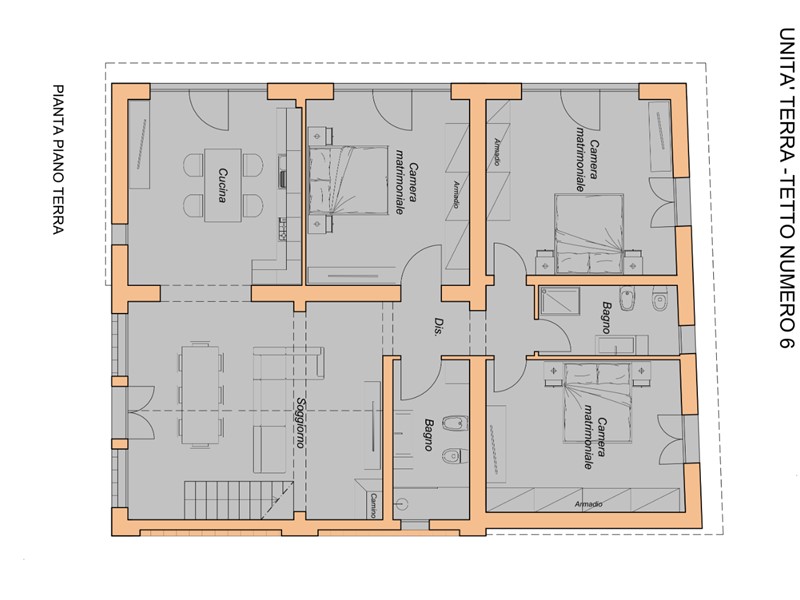 L’abitazione comprende un ampio ingresso/soggiorno con caminetto, cucina abitabile, disimpegno notte, tre luminose camere matrimoniali e due bagni, entrambi finestrati, uno con diccia e l’altro con bagno.