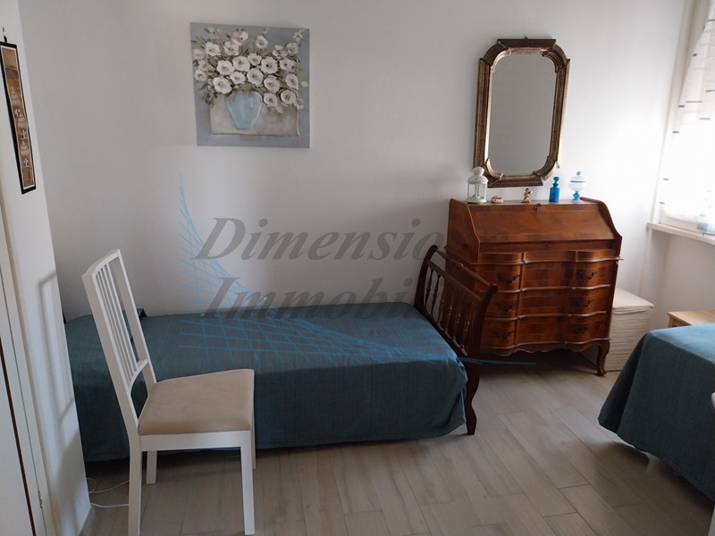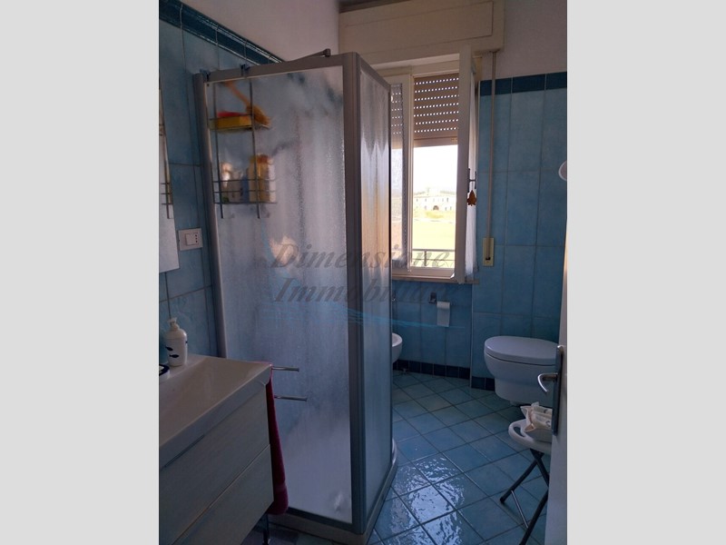 Trilocale al piano 1° con terrazza angolare, soggiorno/pranzo, cucinotto, camera matrimoniale con in più lettino singolo, 2° camera con n°2 letti singoli e servizio con sanitari sospesi, cabinaq doccia e finestra.