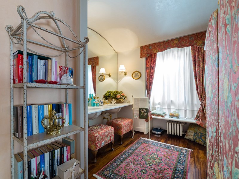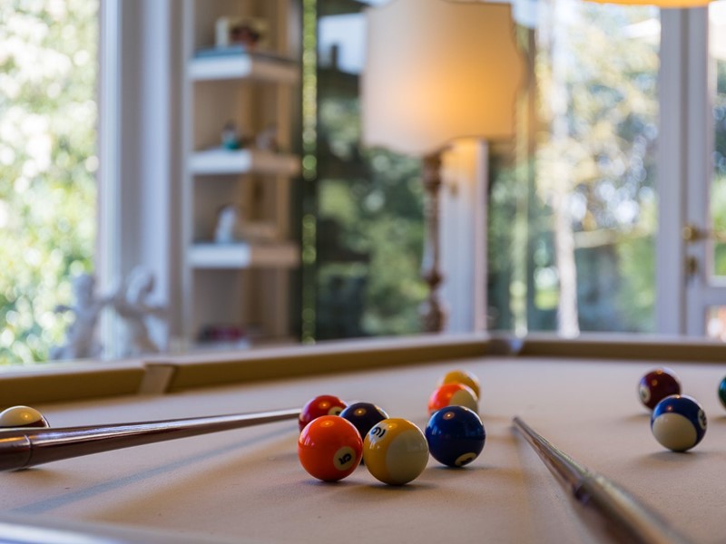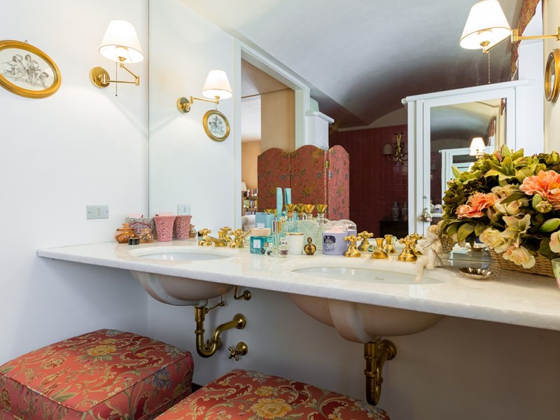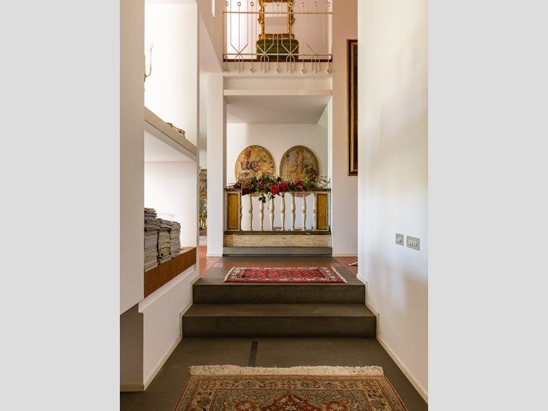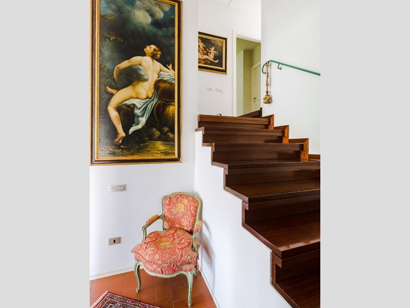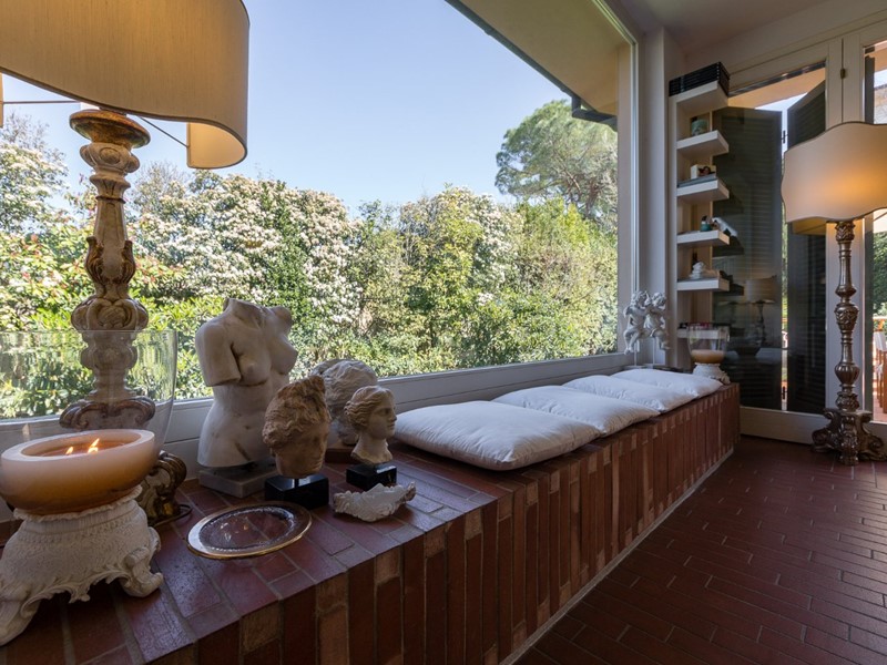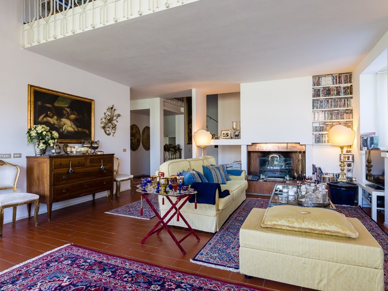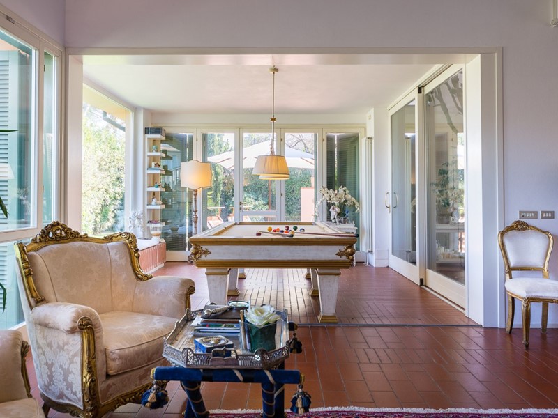 COMPOSIZIONE: ingresso, grande zona living costituita da salone con camino, sala biliardo, chiostra interna, sala pranzo, cucina, veranda vetrata con giardino d'inverno, disimpegno, bagno, grande locale lavanderia, suite matrimoniale con locale armadi e sala da bagno, camera con bagno privato e studio, ulteriore camera con bagno di servizio interno, locale armadi, grande ballatoio-studio con affaccio "doppio volume" sulla zona living. Corredata da garage doppio e locali ripostiglio. L'immobile è circondato da un curato giardino privato.