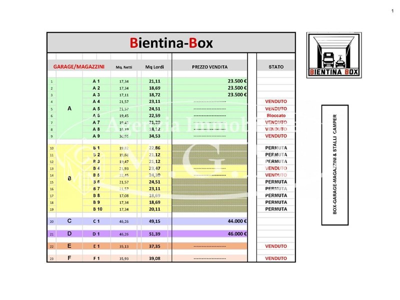 L’intervento, UNICO NEL SUO GENERE, commercializzato dall’Agenzia IMMOBILIARE M.G.M. & Agenzia LOTTI e Realizzato dalla ditta FOSSETTI COSTRUZIONI srl, prevede la conversione dell’Ex-OFFICINE POGGETTI, situata nel CENTRO del paese di BIENTINA, (a soli 260 ml dalla piazza principale), angolo Via Vittorio Veneto ( a senso unico) e Via Galileo Galilei ( doppio senso), in un complesso adibito, BOX, GARAGE, MAGAZZINI di varie dimensioni destinati al parcheggio di Veicoli ( AUTO – FURGONI - CAMPER – BARCHE – MOTO, ecc) o DEPOSITO materiale e/o magazzino per negozi/attività in genere. Vietato l’uso professionale come laboratorio (NO - LABORATORIO). Saranno presenti anche ampi STALLI privati ESTERNI per PARCHEGGIO CAMPER, dotati di servizi;