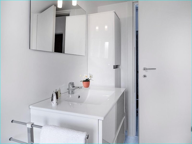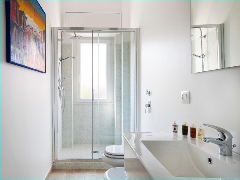 La zona notte include un bagno con ampia cabina doccia e una camera da letto, arredata con letto matrimoniale, armadio a sei ante e cassettiera e dalla quale si accede a un secondo balcone, anch'esso con vista sul verde e sulla chiesa di Sant'Andrea.