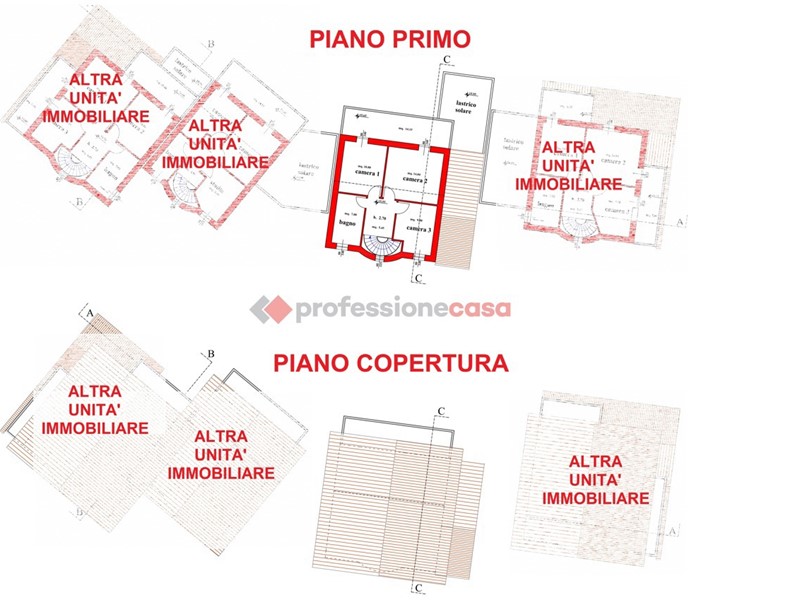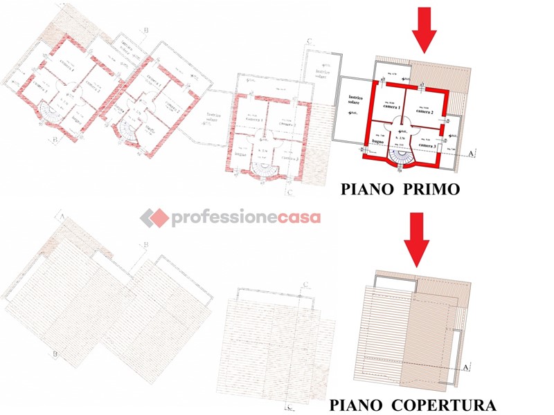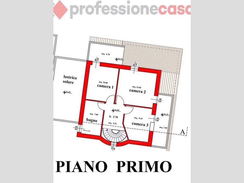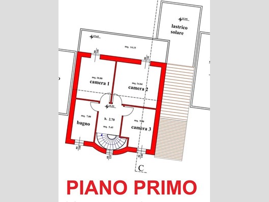 Da una scala angolare progettata con criterio, si accede al piano superiore, piano primo, dove troviamo, corridoio, tre camere ognuna con accesso su balcone e bagno finestrato.