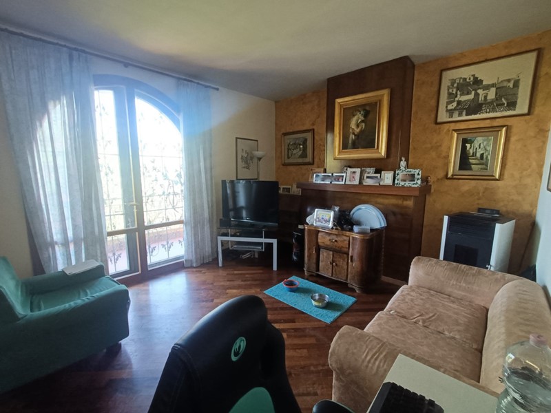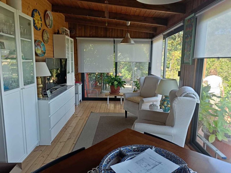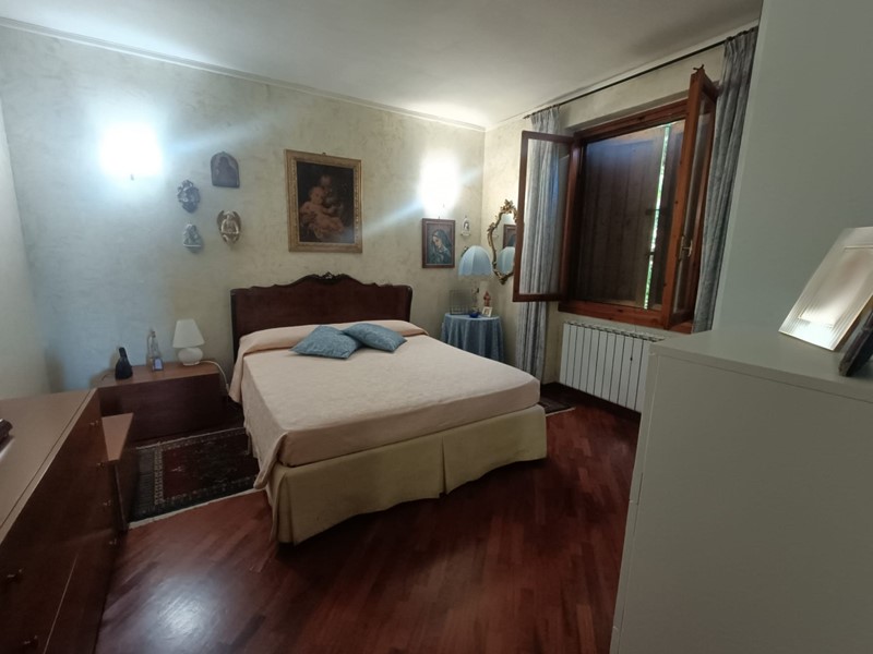 Ci sono tre accessi da ampie portafinestre ad arco, finestra interna in legno, e inferriata esterna lavorata con vetro. Da questi tre ingressi si entra nella zona giorno che è divisa in cucina abitabile con dispensa, salone pranzo, salotto con camino. Questi tre ingressi insistono sulla meravigliosa terrazza panoramica in parte coperta con loggia. Sempre al piano terra troviamo una prima camera matrimoniale con bagno, al piano superiore invece due ulteriori camere matrimoniali e stanza da bagno con vasca.