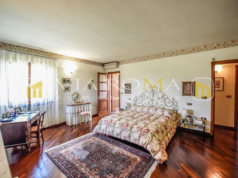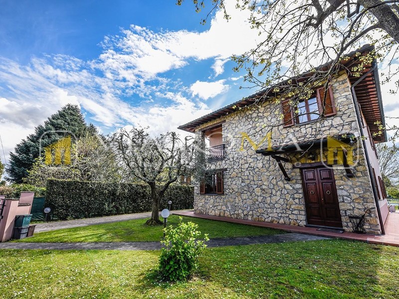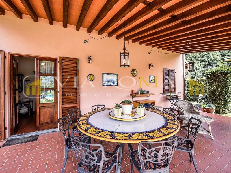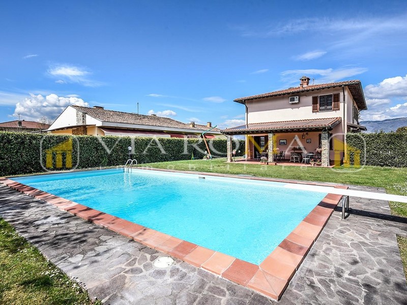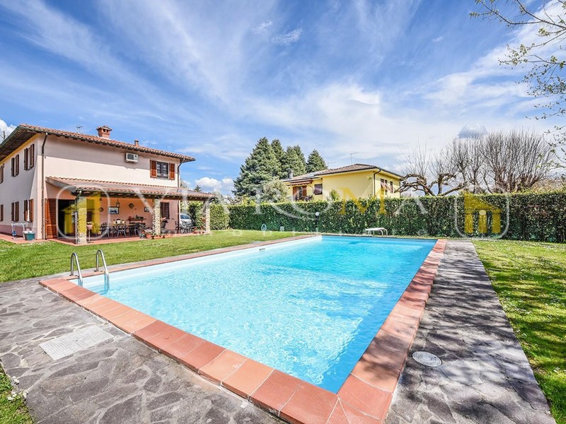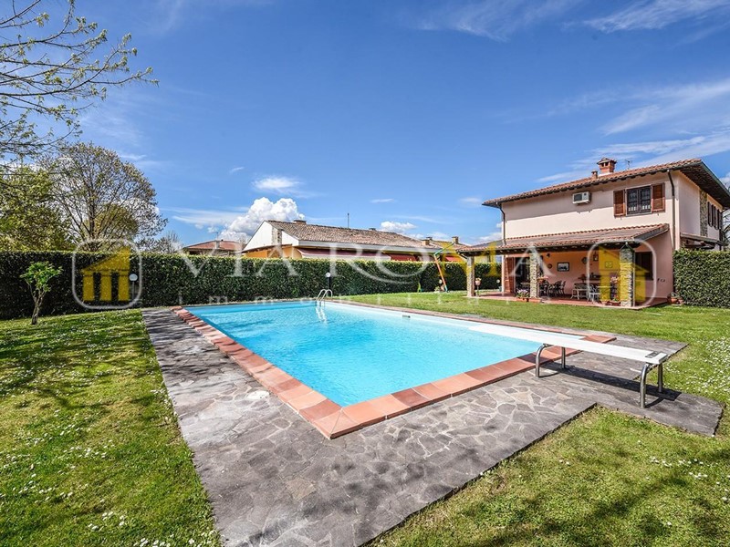 Villa singola disposta su due livelli corredata da giardino e piscina, si compone di: ingresso, ampio soggiorno, zona pranzo con caminetto e cucina, disimpegno bagno e garage al piano terra, al primo piano camera padronale con terrazza, camera matrimoniale, camera doppia camera singola e due bagni.  Scale interne  ampie in  parquet, infissi in legno con persiane.  Corredata da ampio porticato abitabile.  Perfette condizioni di manutenzione.