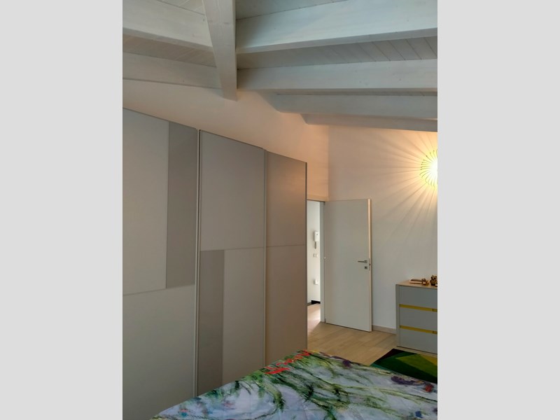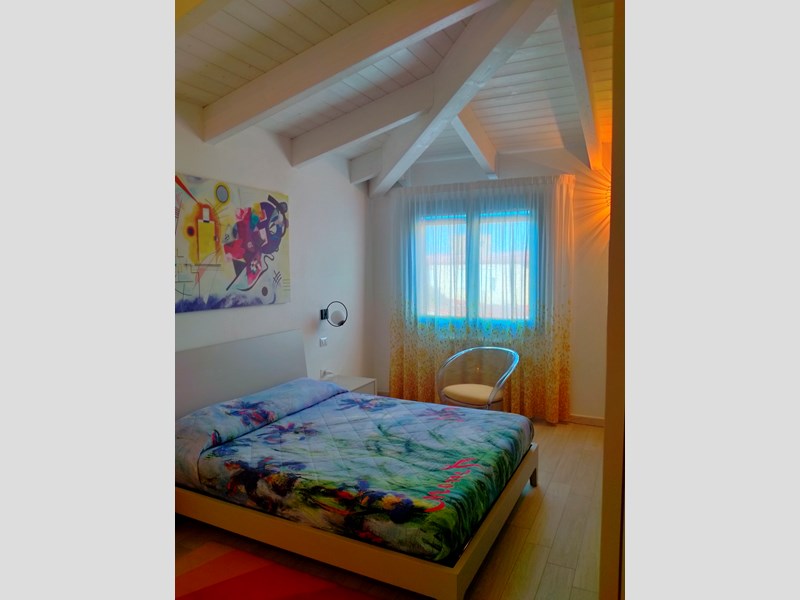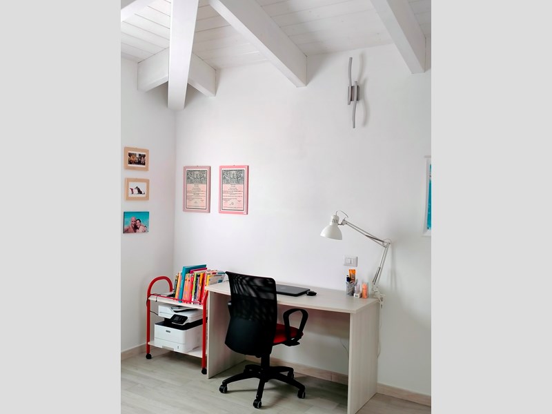 Una scala con gradini rivestiti in legno conduce al piano primo costituito da una camera da letto matrimoniale (18 mq) un bagno e da altre due camere della superficie di mq 13 ciascuna .