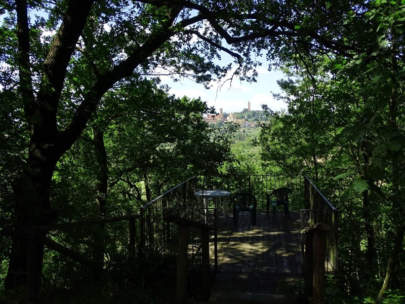 Al primo piano (167 mq.) l’abitazione comprende ingresso, cucina, ampia sala da pranzo con camino, tre camere da letto, due ripostigli e due bagni, oltre ad una grande terrazza panoramica per ulteriori 40 mq. circa. Da questa, grazie ad una passarella in legno, si accede ad un grazioso belvedere seminascosto tra gli alberi, dal quale si gode di una bellissima vista sul borgo di San Miniato.