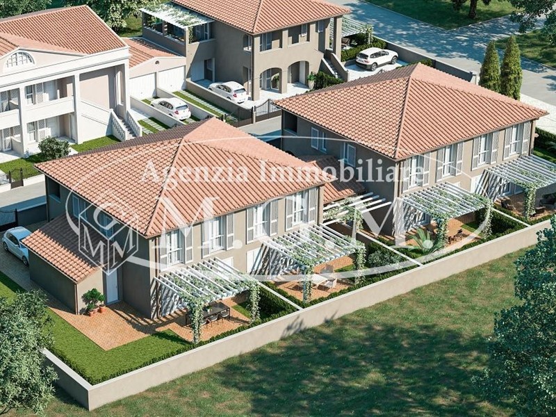 PONTEDERA BELLARIA Prossimo intervento edilizio per la costruzione di Villette Bifamiliari con giardino e garage. La villetta è composta al piano terra da loggiato con ingresso in ampio soggiorno, cucina abitabile, bagno e garage, al piano primo troviamo 3 camere, doppi servizi e balcone. Finiture di alta qualità, con impianto fotovoltaico, riscaldamento a pavimento solare, predisposizione impianto allarme, clima e addolcitore, ecc.. Possibilità di personalizzare l'immobile.