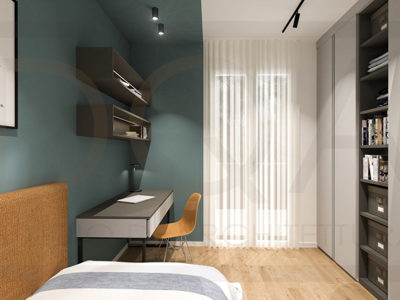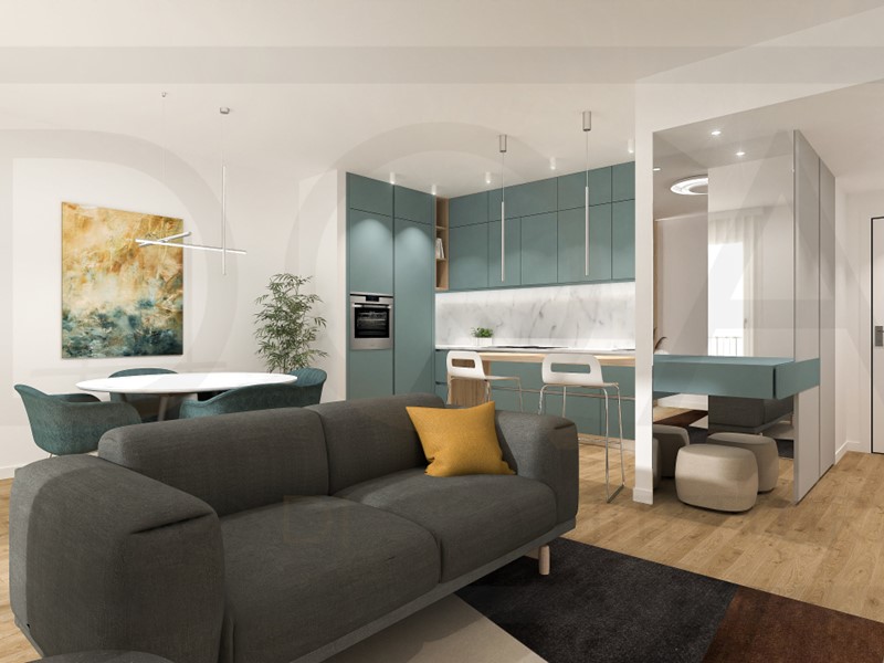 Composto da ingresso, soggiorno con cucina a vista e loggia di 15 mq, ripostiglio, 2 camere da letto e doppi servizi (uno interno alla camera matrimoniale).