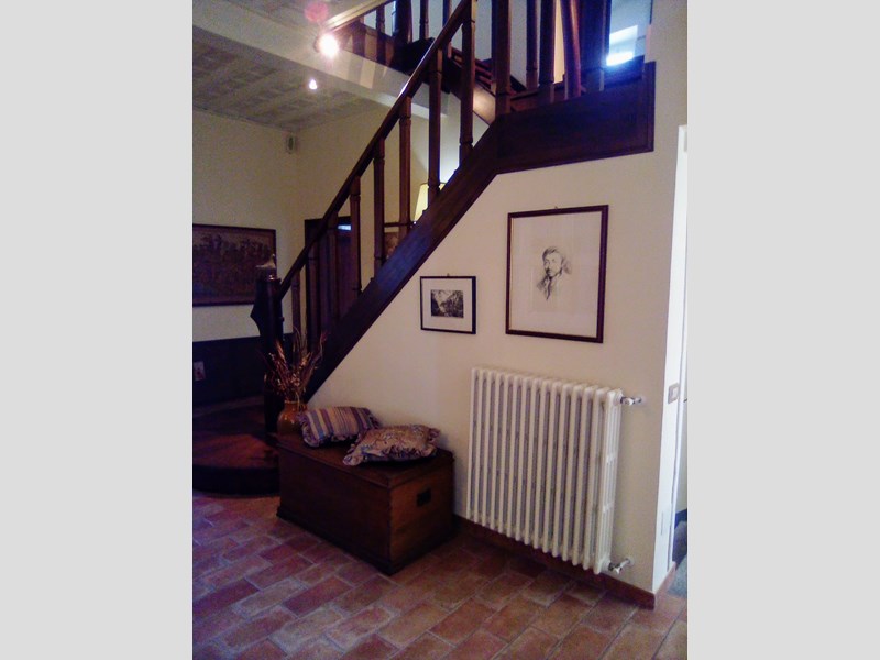 Al primo piano si trova un ampio ingresso che apre su un bellissimo salone con antico camino e con una magnifica libreria.