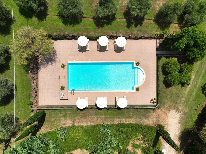 La bellissima piscina domina la bellissima vallata ed è circondata da fiori e ulivi, con una zona adibita a lettini, tavoli e sedie con ombrelloni. Il bellissimo giardino che circonda la villa offre dei panorami mozzafiato. La proprietà gode di assoluta privacy circondata dai suoi due ettari di terreno, con la possibilità di costruire campo da tennis.