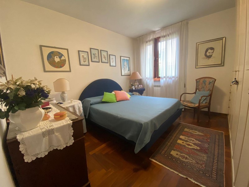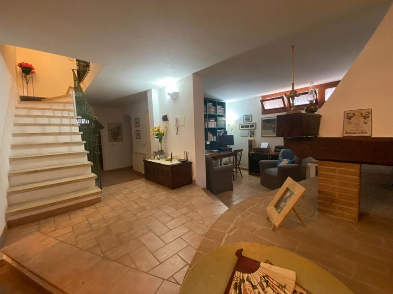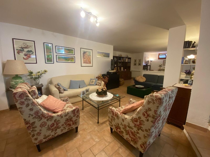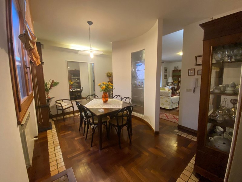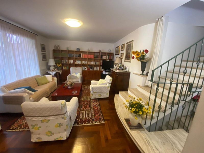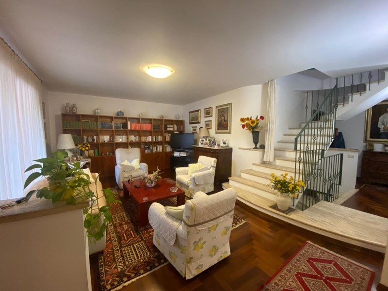 Al piano rialzato ingresso indipendente dal giardino alla veranda abitabile, disimpegno d’ingresso, soggiorno, tinello/zona pranzo con cucina separata e veranda di servizio; disimpegno di accesso alla zona notte, due camere da letto matrimoniali, una camera singola/studio e due bagni. Dal soggiorno mediante bellissima scala interna si accede all’ampia e rifinita taverna di ca. 100 mq con grande camino, cucina e zona studio, oltre a bagno con finestra. Accesso a grande garage di ca. 25 mq.