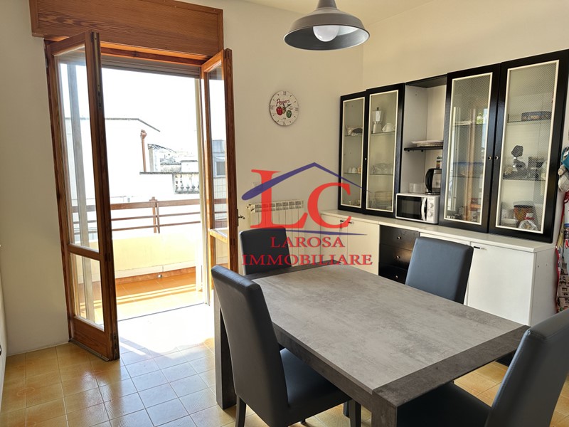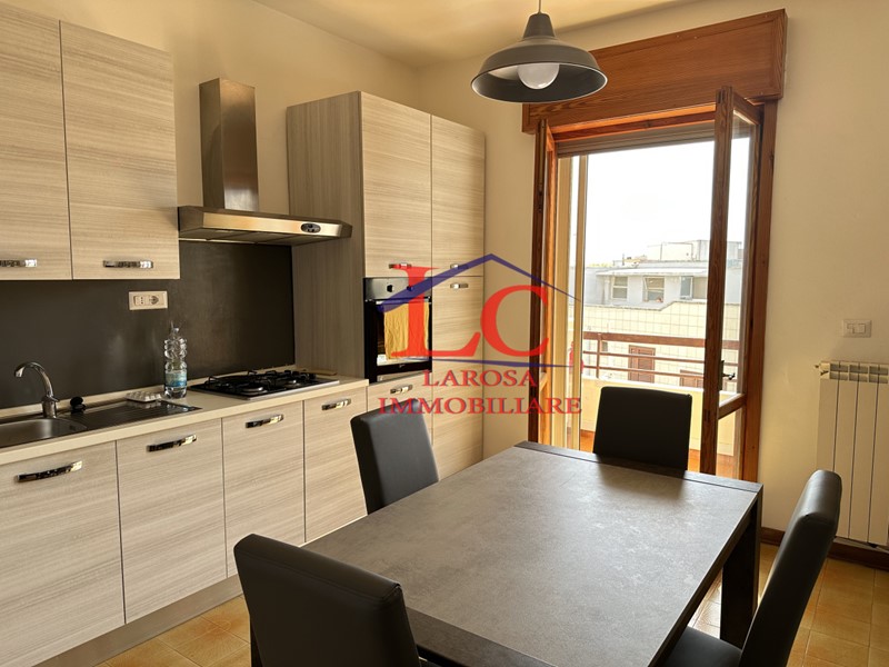 Adiacente al soggiorno, la cucina separata offre uno spazio funzionale e raffinato. Completa di forno, fuochi a gas e lavandino, si distingue per un pratico tavolo con quattro sedie e una credenza che accresce il suo charme. Un balcone con tenda da sole avvolgibile diventa l'angolo ideale per colazioni all'aperto o momenti di relax.