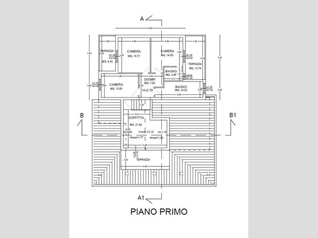 L'immobile di circa 230 mq, si sviluppa su più livelli: cantina di circa 20 mq al piano seminterrato con porticato, piano terra (zona giorno con splendido portico di 50 mq e taverna), piano primo (zona notte composta di tre camere, due bagni e due belle terrazze), mansarda con terrazza, utilizzabile anche come camera o studio.