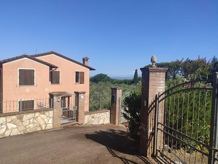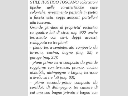 Incantevole villa singola nuova di circa 250mq, con caratteristiche rifiniture rustiche toscane in pietra, immersa in un giardino su quattro lati di circa 900 mq con vista sulla campagna toscana, l'immobile si sviluppa su tre livelli, il piano terra, in parte seminterrato con un altezza più che vivibile, è occupato da una grande taverna doppia con soffitti a volte sabbiate, da un garage molto ampio e da un locale lavanderia che si sviluppa anche in parte del sottoscala, al primo piano, al quale si accede anche dalle scale esterne loggiate, si trova il reparto giorno  con cucina abitabile, sala pranzo, soggiorno con scale a vista e bagno, le tre camere, tutte matrimoniali, sono al secondo piano con gli altri 2 bagni, un dei quali con accesso diretto da una delle camere. i soffitti dei piani sono a travi e travicelli in legno tipici della tipologia costruttiva della toscana rurale, l'immobile ha delle finiture che ben si sposano con il livello di prestigio di tutto il contesto.
