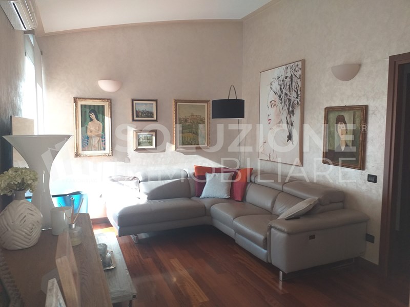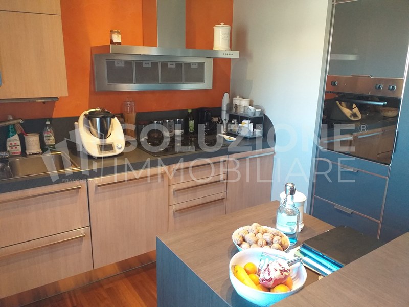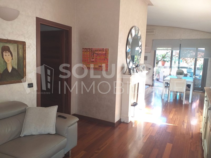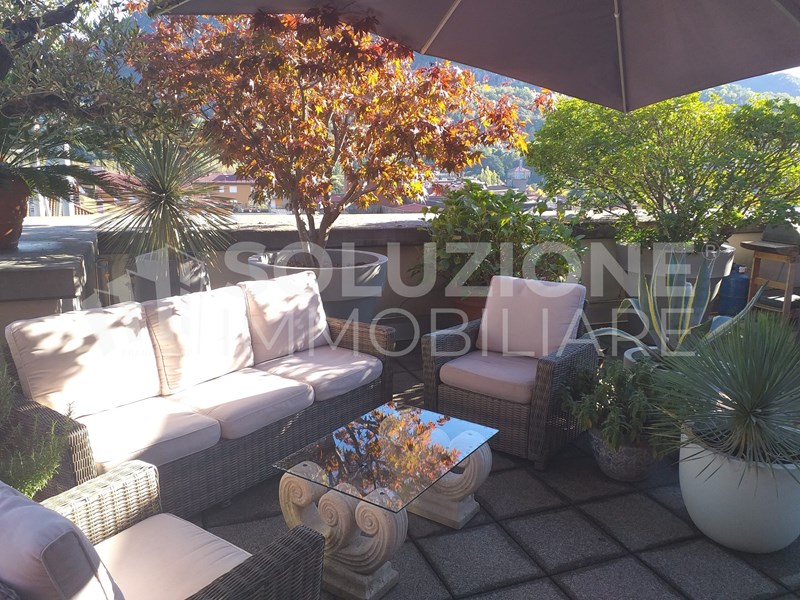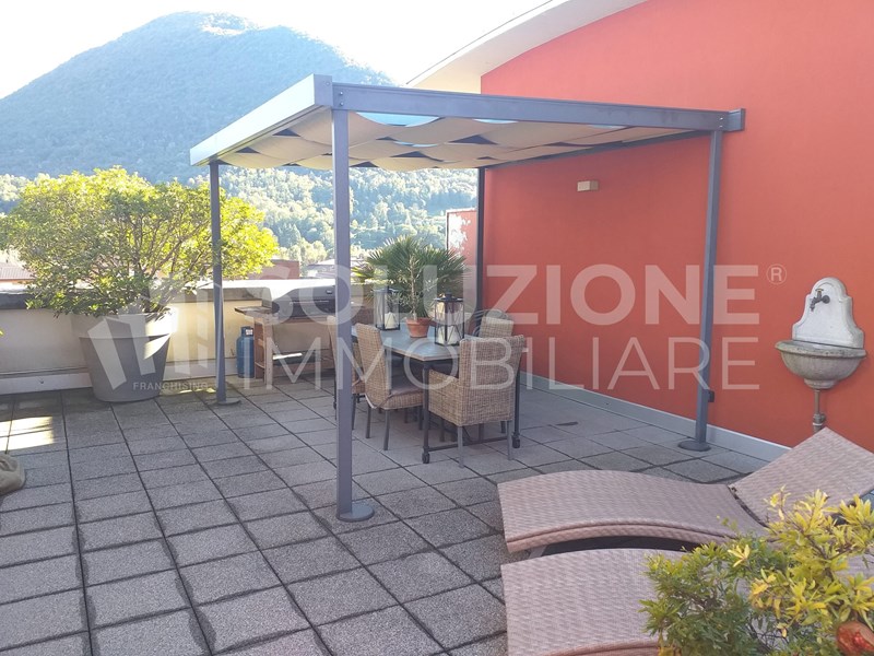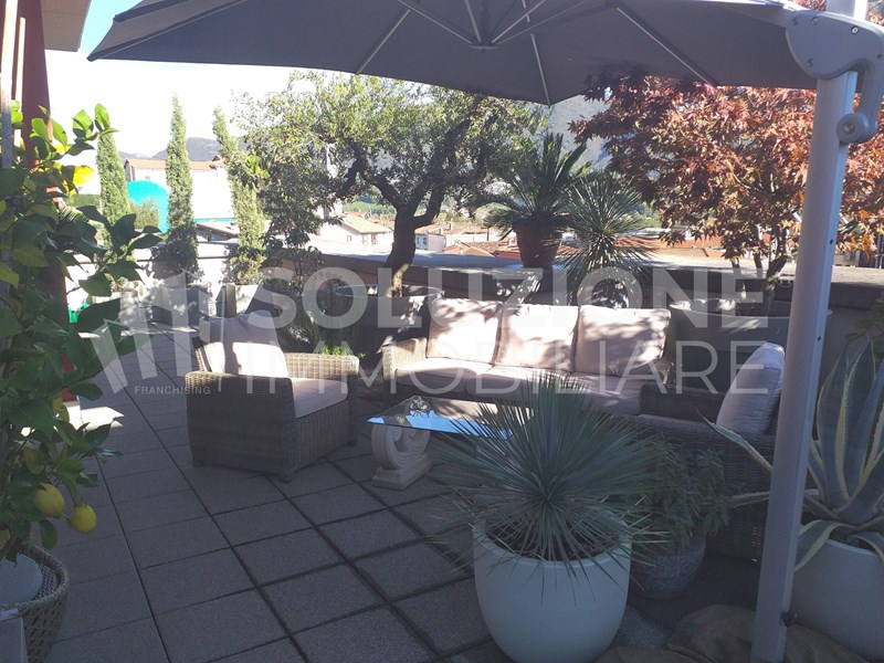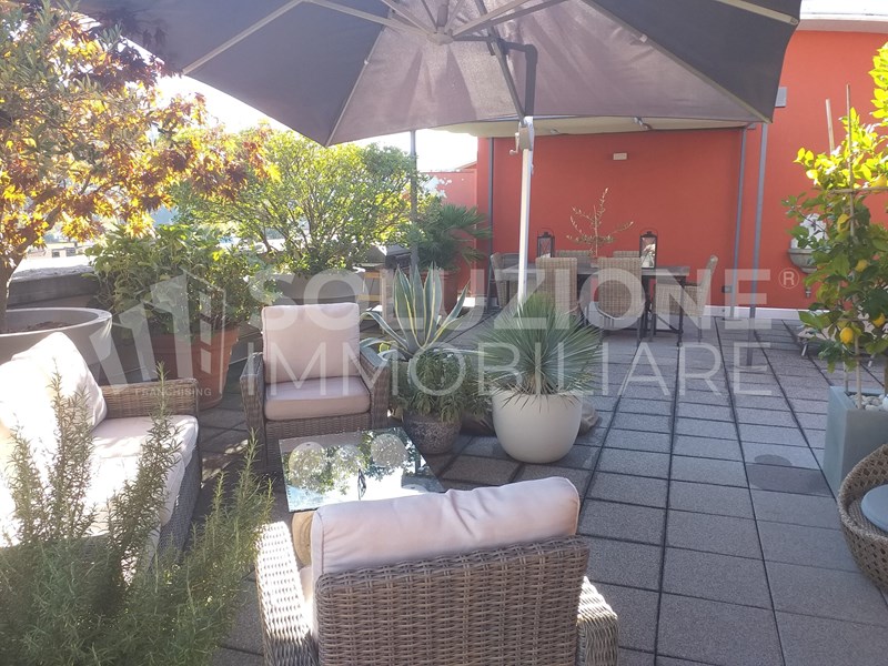 ALBINO: In pieno centro città panoramico Attico di mq 115 così disposto: Ingresso, Zona attesa con mobile su misura, Soggiorno/Sala pranzo, Cucina abitabile, Salotto/zona TV (originariamente terza camera), Disimpegno notte, due Camere, Doppi servizi con vasca e doccia e Terrazzo mq 160 che gira intorno l'appartamento. Completa la proprietà Cantina e n. 2 Autorimesse singole adiacenti una all'altra. L'immobile è come nuovo ed al suo interno troviamo Riscaldamento a pavimento, aria condizionata in tutti gli ambienti, tapparelle elettriche, zanzariere in zona notte, antifurto sia perimetrale che volumetrico, videocitofono, parquet in tutti gli ambienti (tranne bagni) e ceduto parzialmente arredato. Il Terrazzo presenta pavimento galleggiante , vasi e fioriere ben tenute e piantumate, irrigazione automatica, angolo con gazebo e zona relax con poltrone.