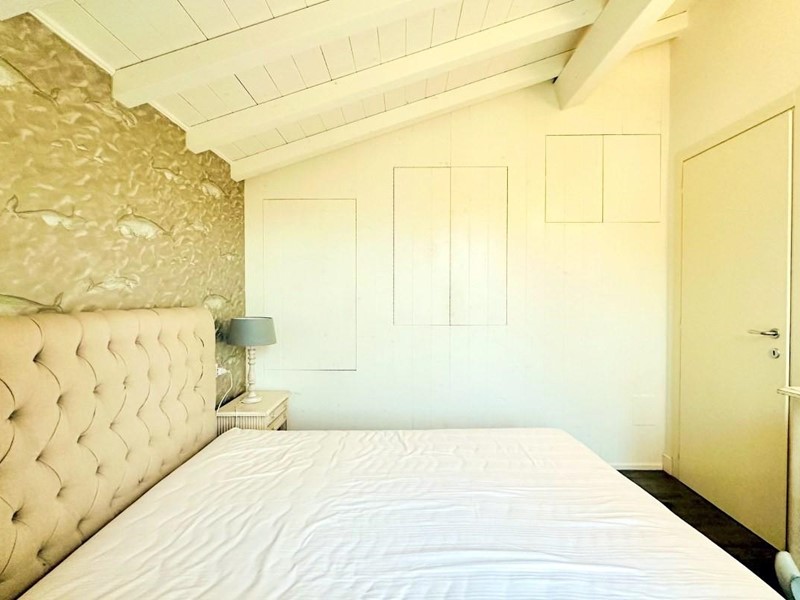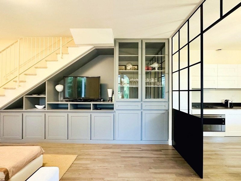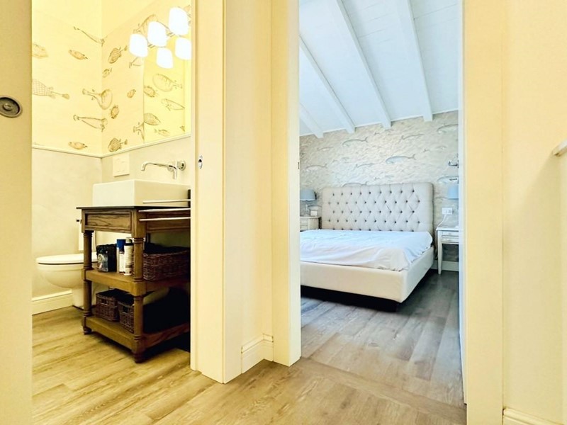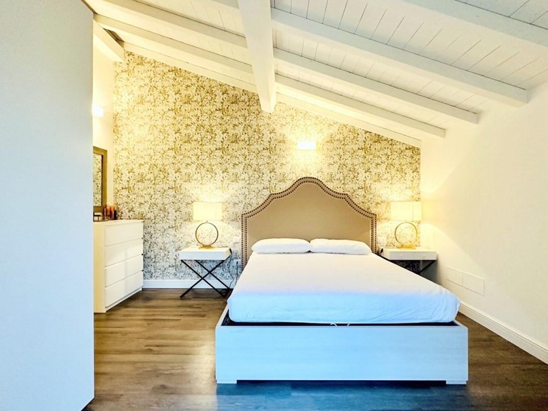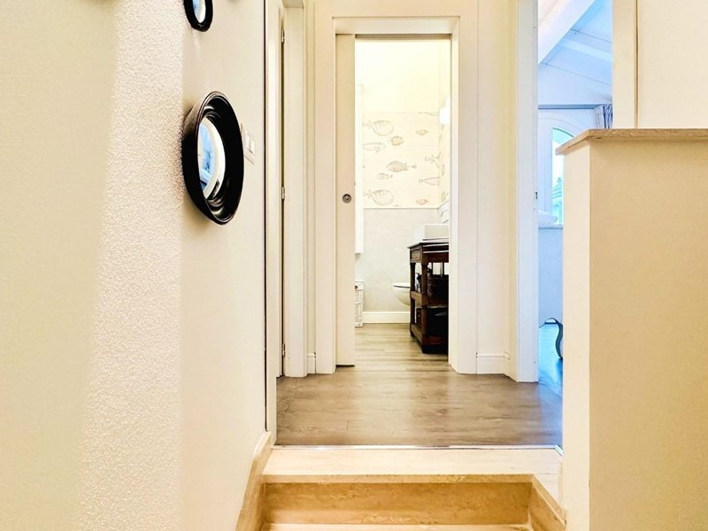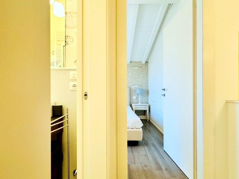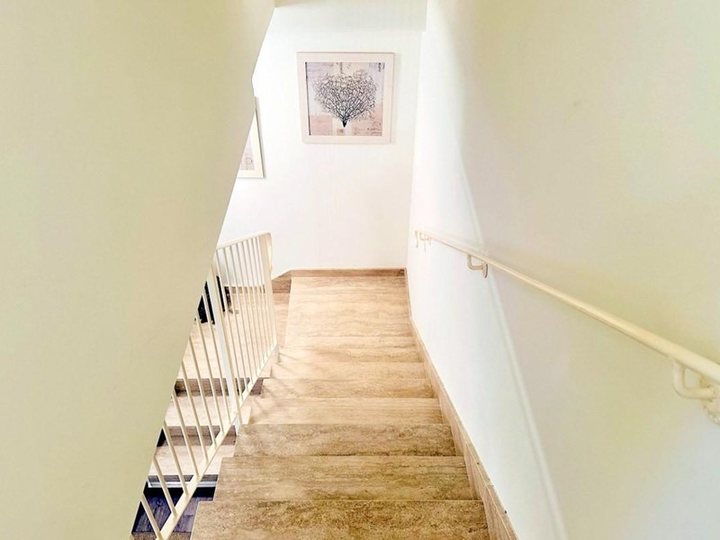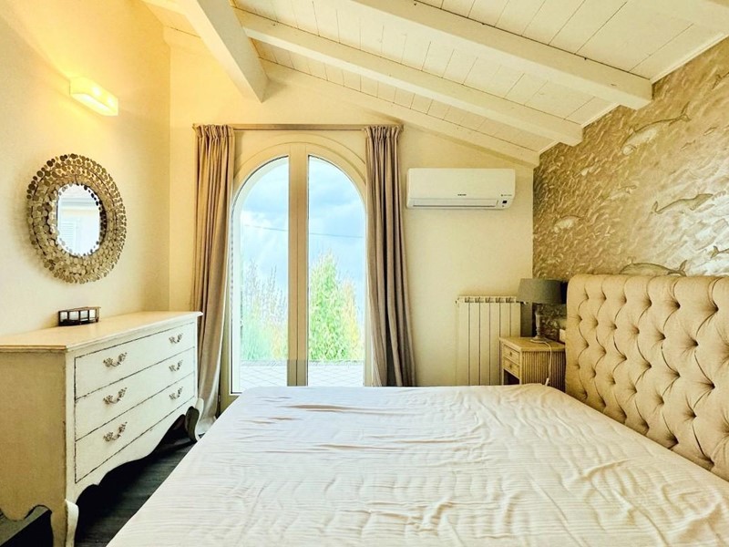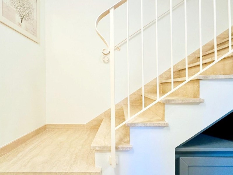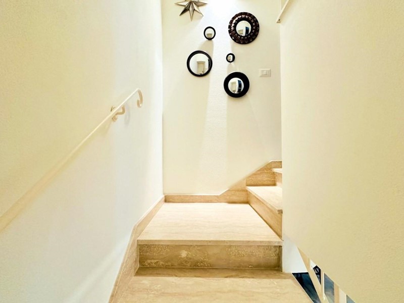 L'ingresso principale alla villa avviene nel disimpegno della zona giorno. Questo importante ambiente risulta composto da un generoso soggiorno ed una cucina abitabile splendidamente divisa da un elegante parete in vetro. Questo livello ospita un primo servizio. Attraverso la scala in travertino si raggiunge la zona notte della casa posto a piano primo. Questo livello risulta in parte sottotetto con travi in legno a vista. Le camere da letto sono due matrimoniali dotate di balcone esclusivo. Entrambe fruiscono di un secondo bagno con la doccia.