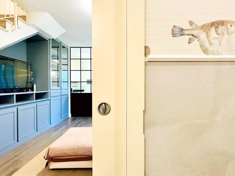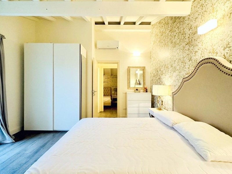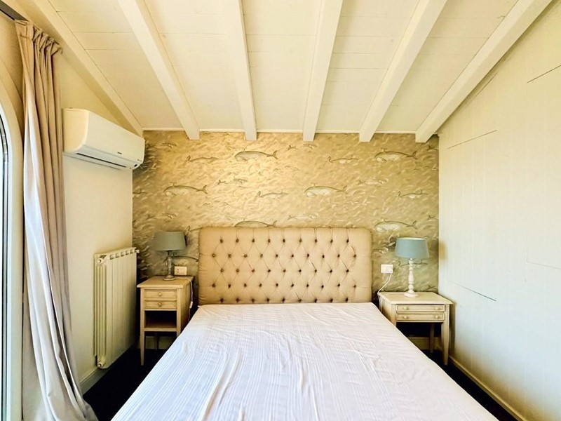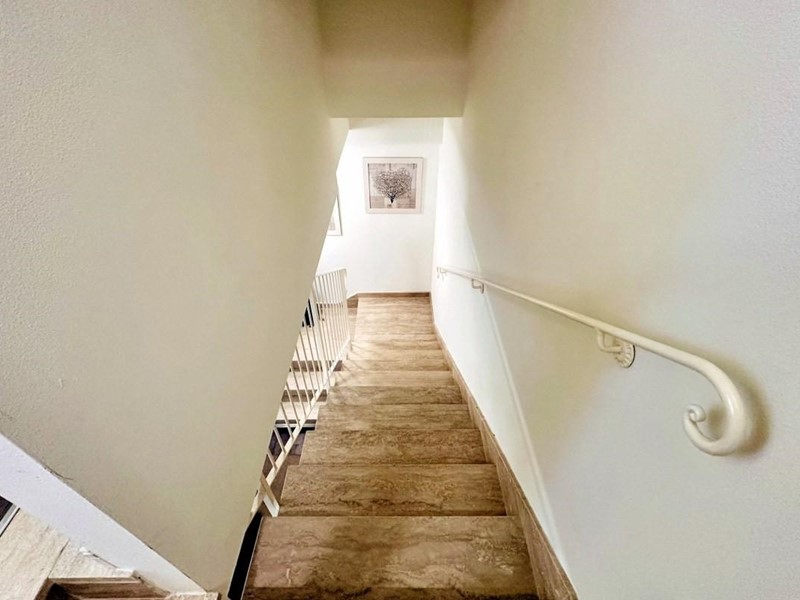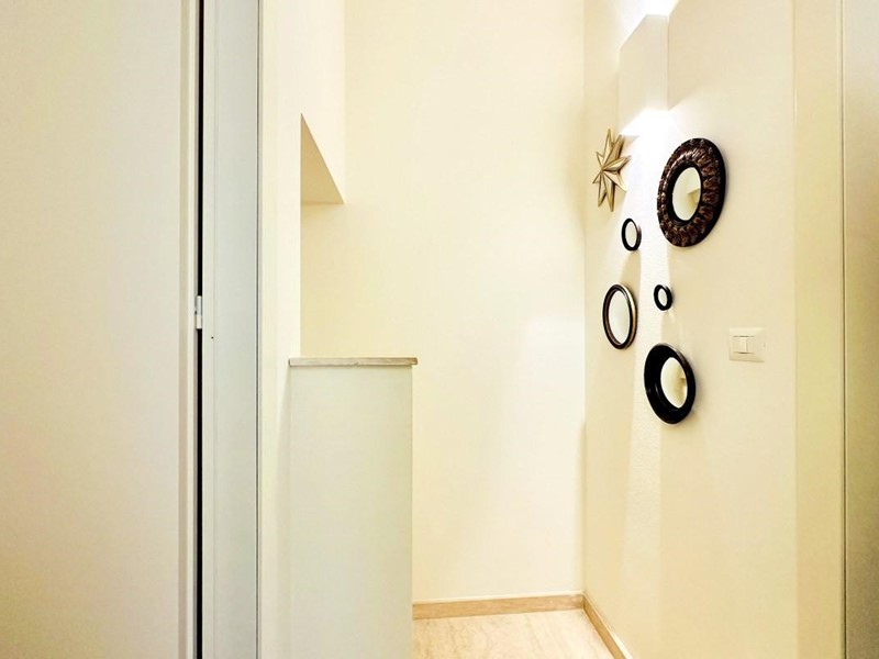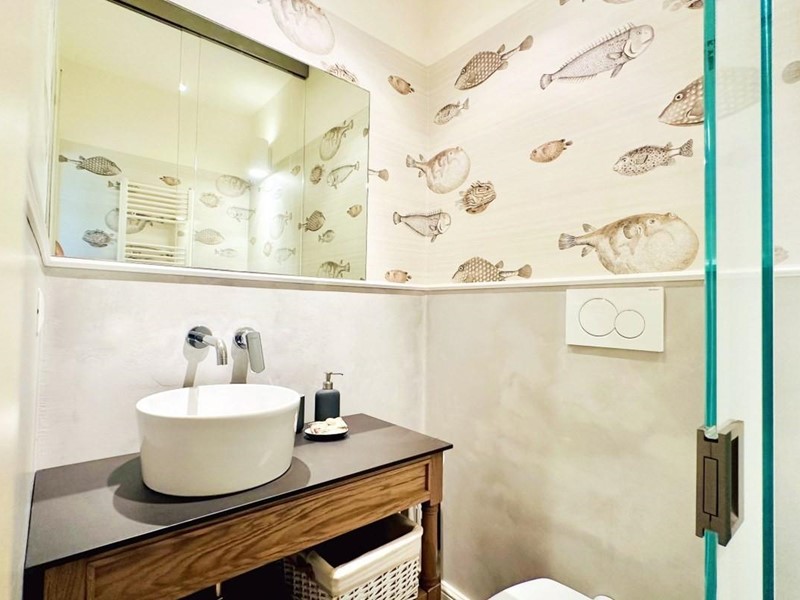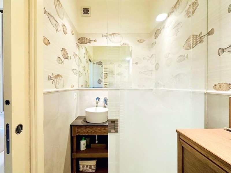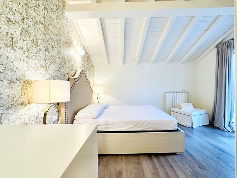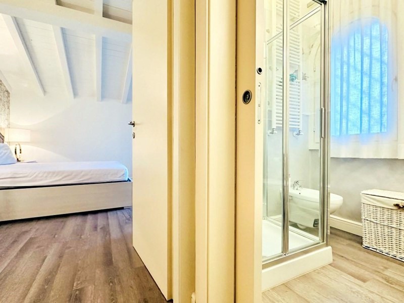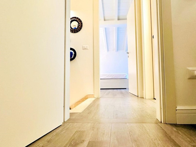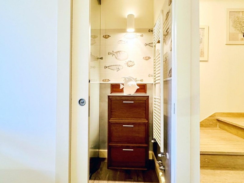 L'ingresso principale alla villa avviene nel disimpegno della zona giorno. Questo importante ambiente risulta composto da un generoso soggiorno ed una cucina abitabile splendidamente divisa da un elegante parete in vetro. Questo livello ospita un primo servizio. Attraverso la scala in travertino si raggiunge la zona notte della casa posto a piano primo. Questo livello risulta in parte sottotetto con travi in legno a vista. Le camere da letto sono due matrimoniali dotate di balcone esclusivo. Entrambe fruiscono di un secondo bagno con la doccia.