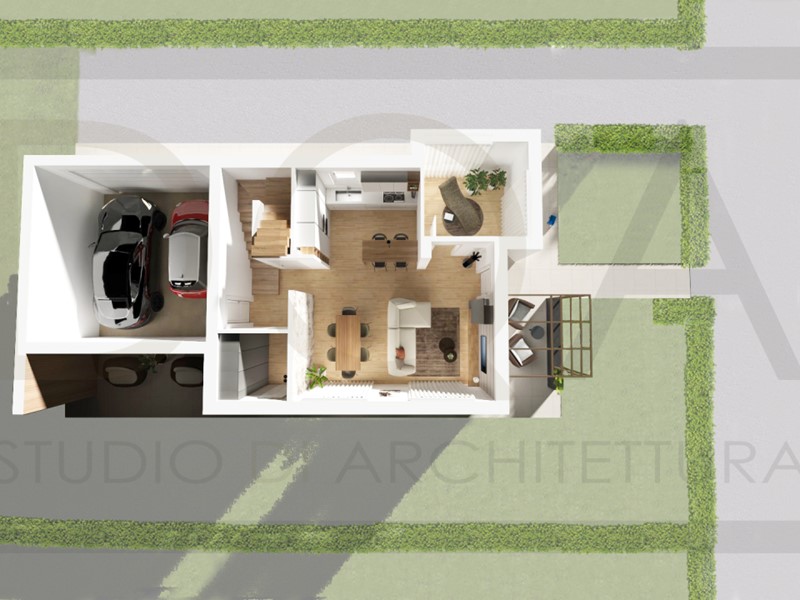 - pianto terra = (83 mq + box 38 mq) ampio soggiorno con cucina a vista (ma separabile ed abitabile), splendida veranda/studio e bagno + garage doppio in larghezza, portico verso Sud, pergolato d'ingresso e 400 mq di giardino.