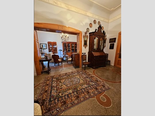 L' ingresso principale che poi separa virtualmente le due ali dell'appartamento ci conduce direttamente nel corpo centrale, dove vi è un susseguirsi di grandi saloni, salotti di ricevimento e zone studio e relax, impreziosite da arredi importanti e da grandi finestre che danno una bella luminosità agli ambienti.