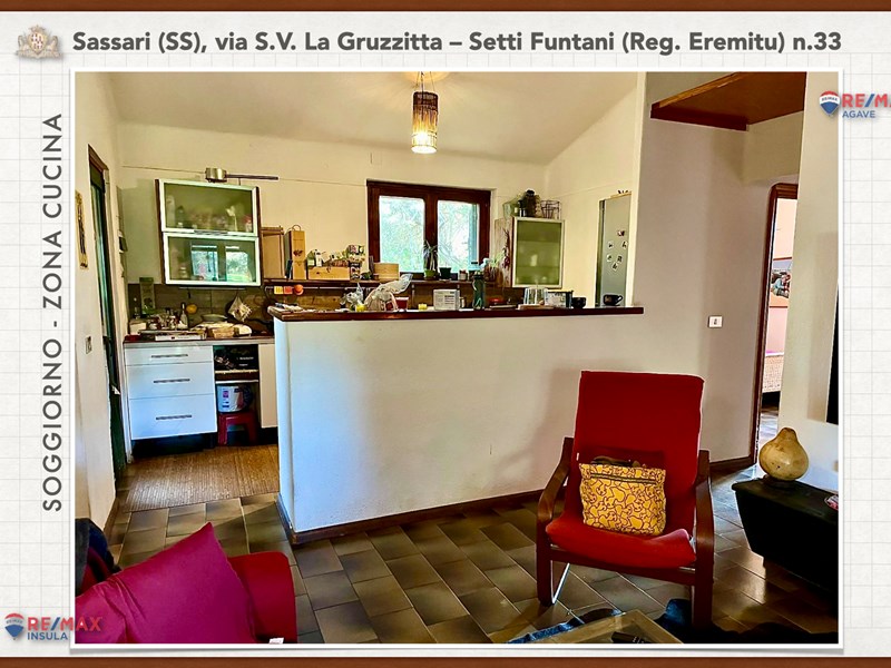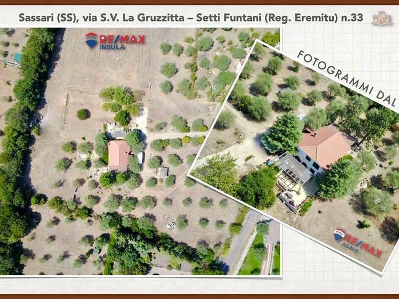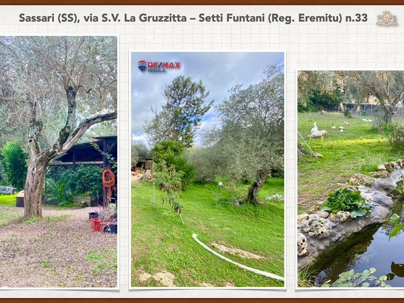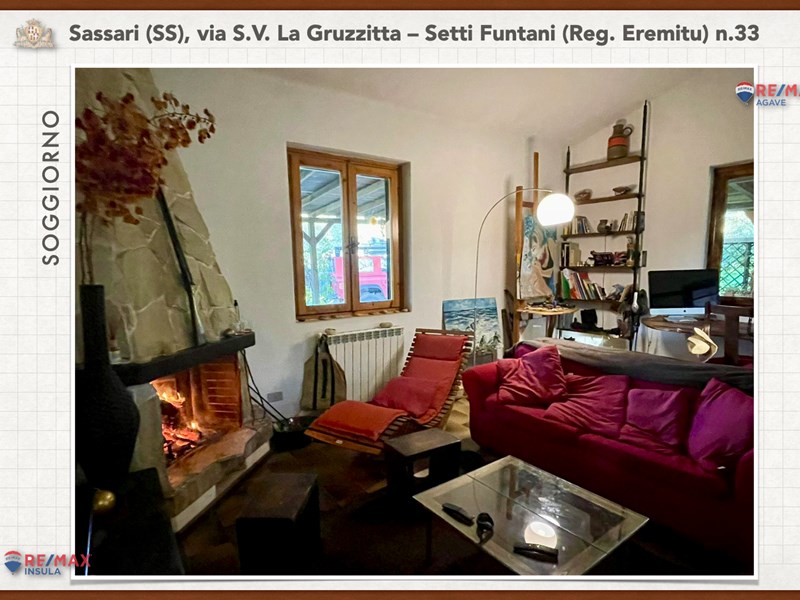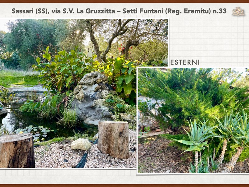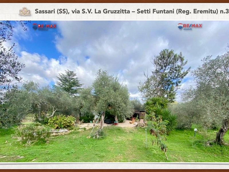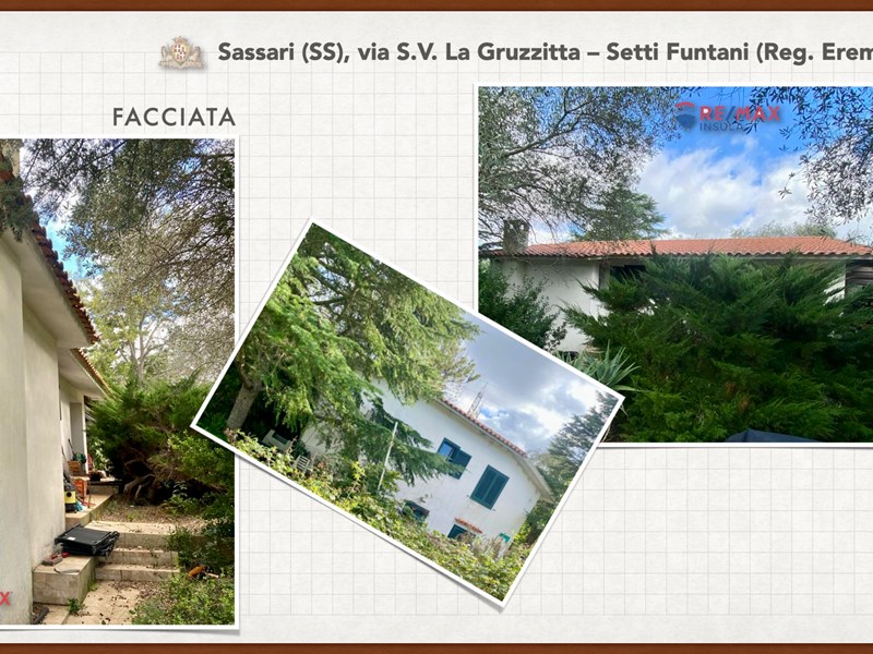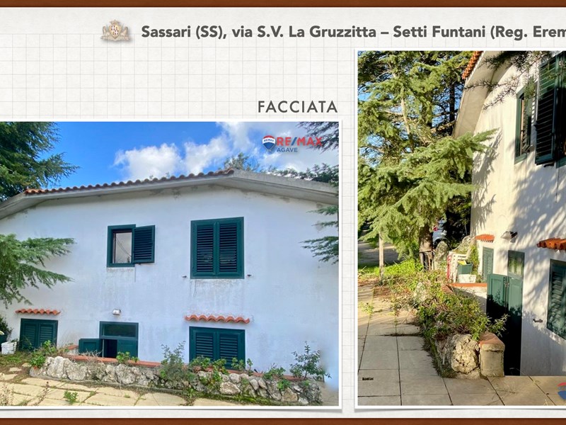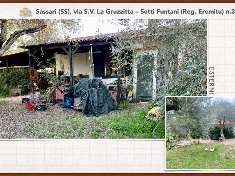 Ampia e luminosa villetta unifamiliare situata in Agro di Sassari, nelle Immediate vicinanze della Città in Regione Eremitu con accesso dalla S.V. La Gruzzitta-Setti Funtani che sbocca sulla Via Milano. L’immobile è collocato in  terreno privato che completa la proprietà e che si estende per mq. 11.535 con diverse piante di ulivo ed anche alberi da frutto. Forma pressoché rettangolare, dalla veranda in muratura esterna si accede al pranzo/soggiorno di ingresso (dotato di caminetto), lateralmente allo stesso è posta la cucina ed un piccolo disimpegno collega alla zona notte e ad una scala interna che porta al piano seminterrato. La zona notte al piano terreno è dotata di 2 camere da letto Più il bagno.