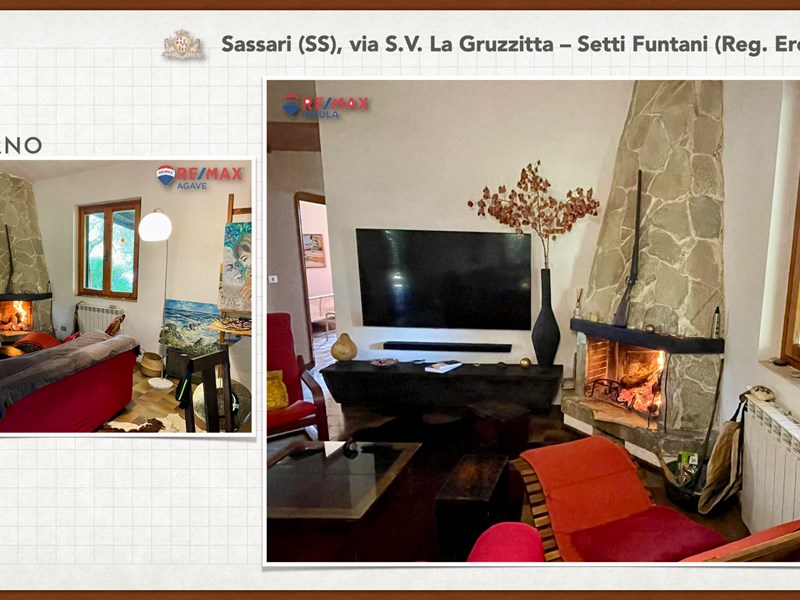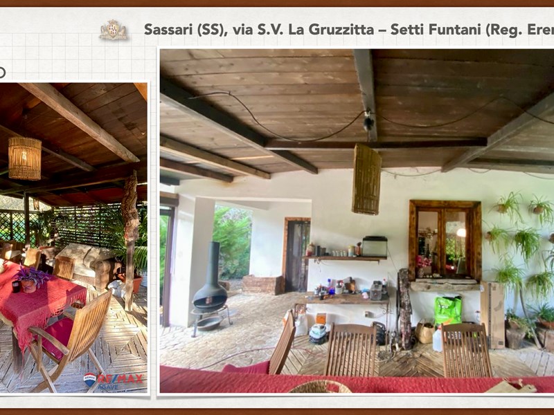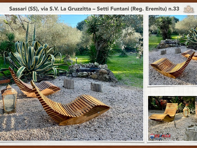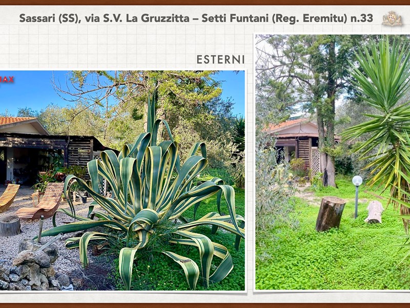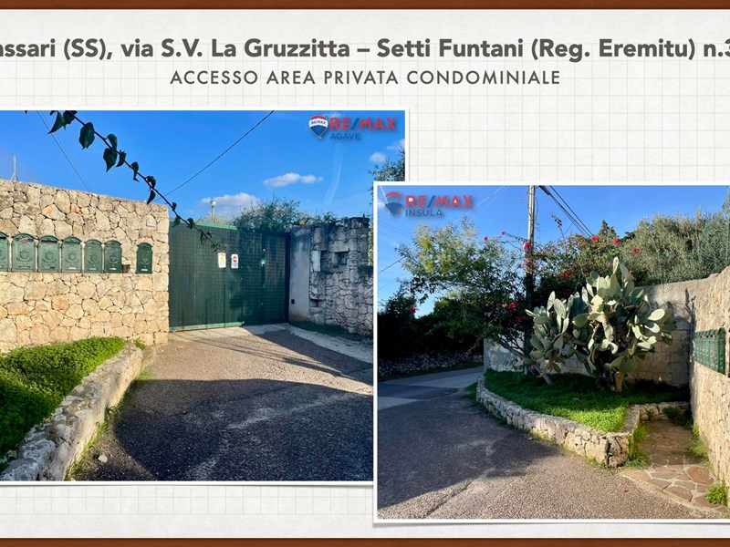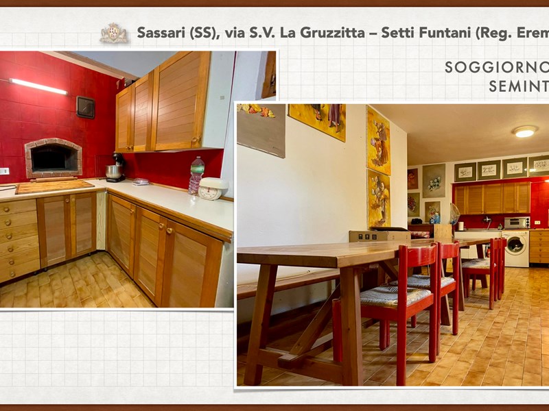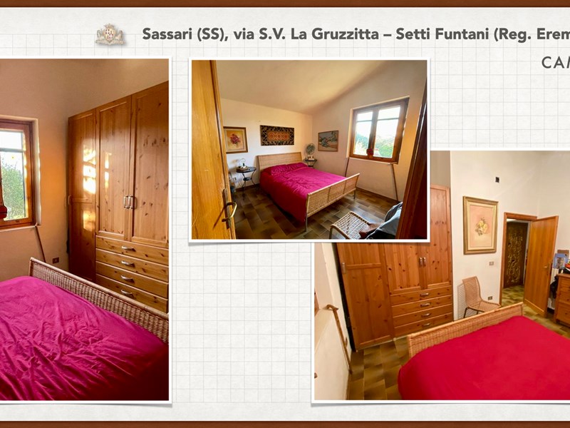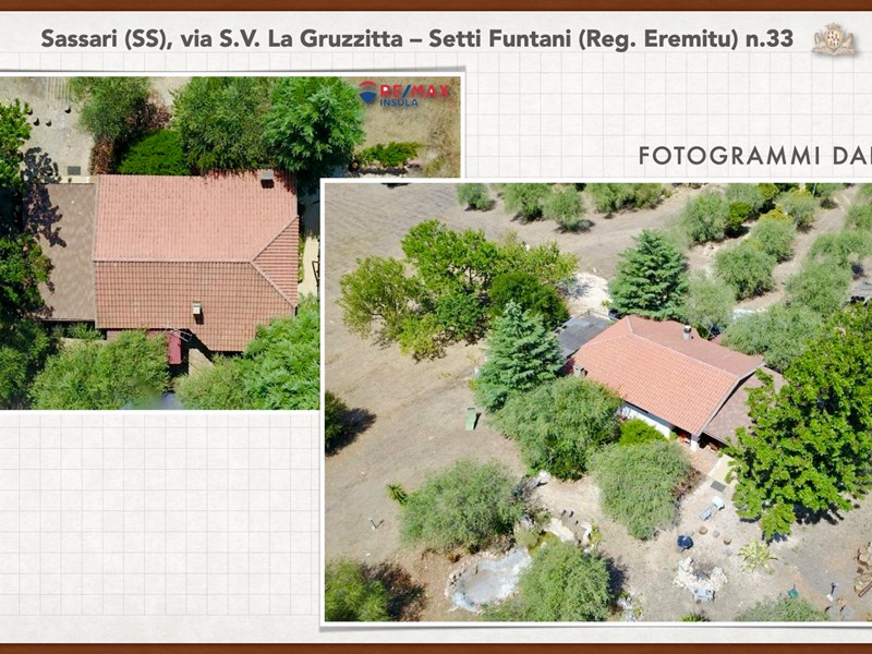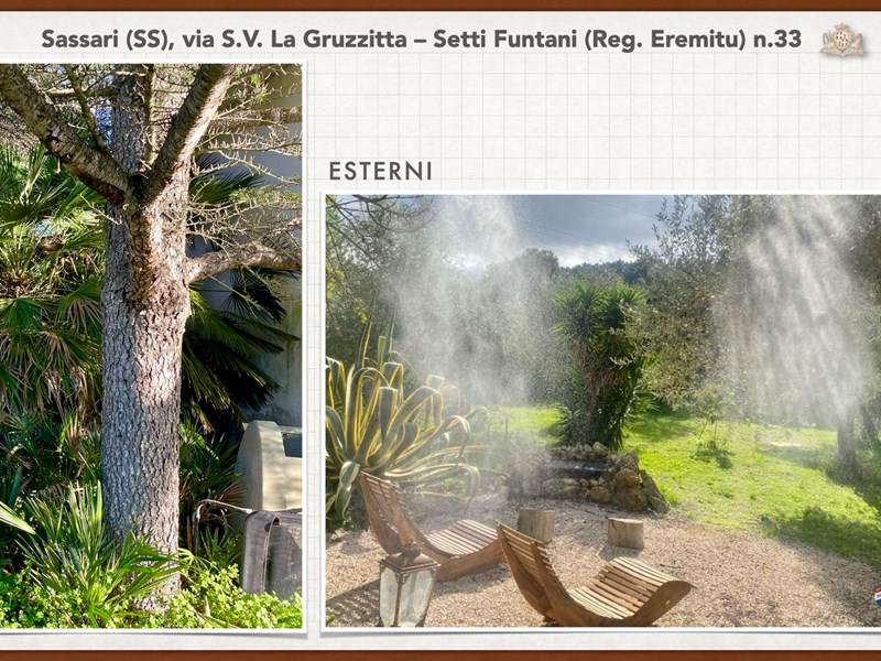 Ampia e luminosa villetta unifamiliare situata in Agro di Sassari, nelle Immediate vicinanze della Città in Regione Eremitu con accesso dalla S.V. La Gruzzitta-Setti Funtani che sbocca sulla Via Milano. L’immobile è collocato in  terreno privato che completa la proprietà e che si estende per mq. 11.535 con diverse piante di ulivo ed anche alberi da frutto. Forma pressoché rettangolare, dalla veranda in muratura esterna si accede al pranzo/soggiorno di ingresso (dotato di caminetto), lateralmente allo stesso è posta la cucina ed un piccolo disimpegno collega alla zona notte e ad una scala interna che porta al piano seminterrato. La zona notte al piano terreno è dotata di 2 camere da letto Più il bagno.