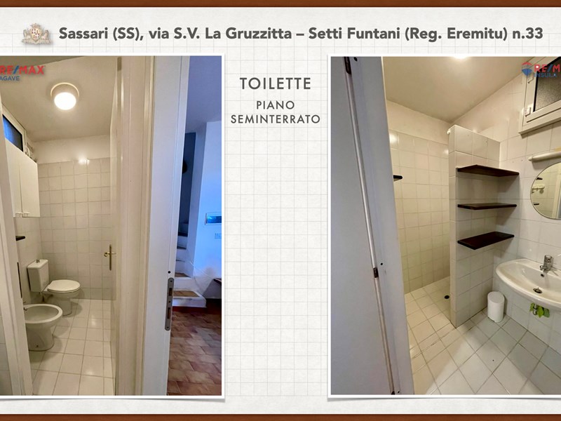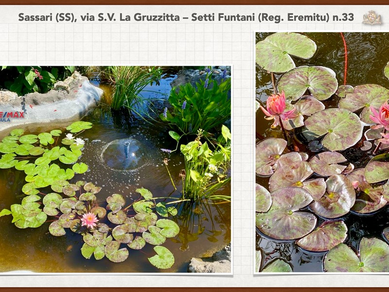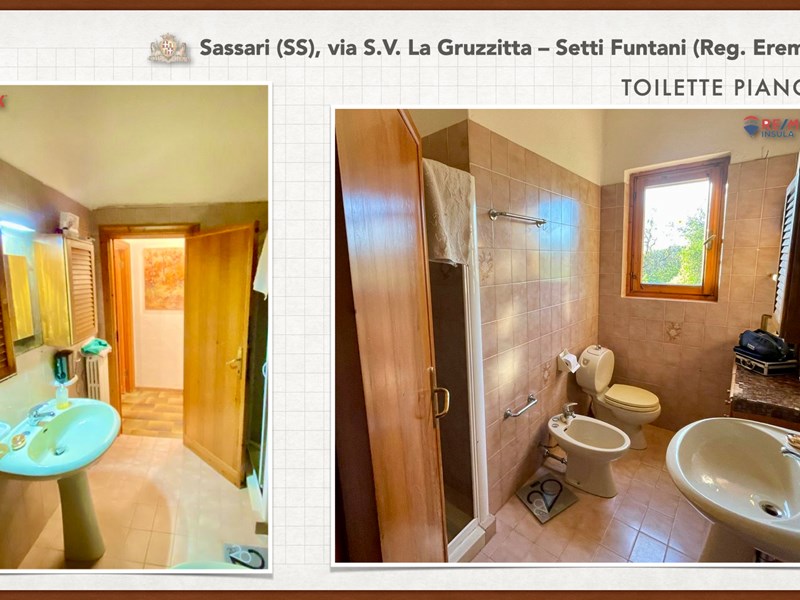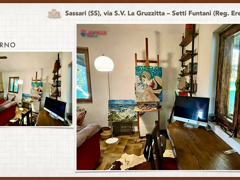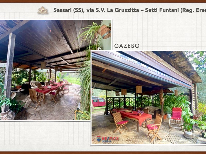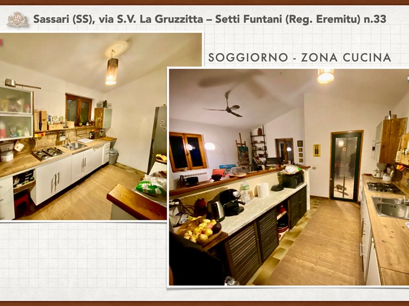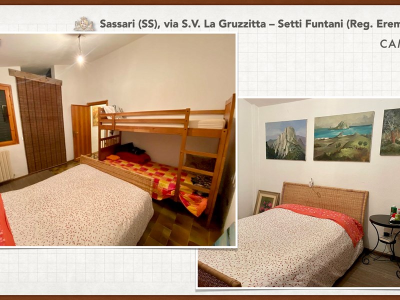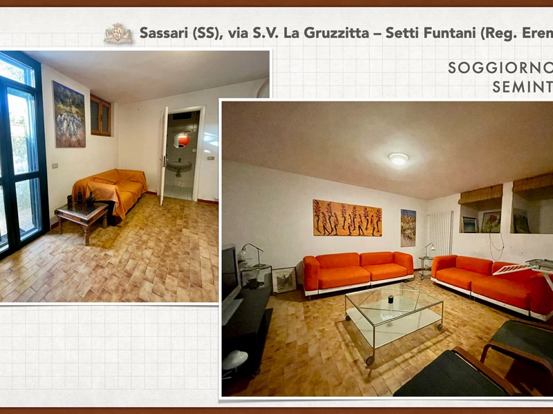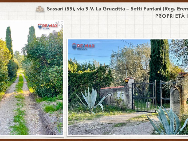 Ampia e luminosa villetta unifamiliare situata in Agro di Sassari, nelle Immediate vicinanze della Città in Regione Eremitu con accesso dalla S.V. La Gruzzitta-Setti Funtani che sbocca sulla Via Milano. L’immobile è collocato in  terreno privato che completa la proprietà e che si estende per mq. 11.535 con diverse piante di ulivo ed anche alberi da frutto. Forma pressoché rettangolare, dalla veranda in muratura esterna si accede al pranzo/soggiorno di ingresso (dotato di caminetto), lateralmente allo stesso è posta la cucina ed un piccolo disimpegno collega alla zona notte e ad una scala interna che porta al piano seminterrato. La zona notte al piano terreno è dotata di 2 camere da letto Più il bagno.