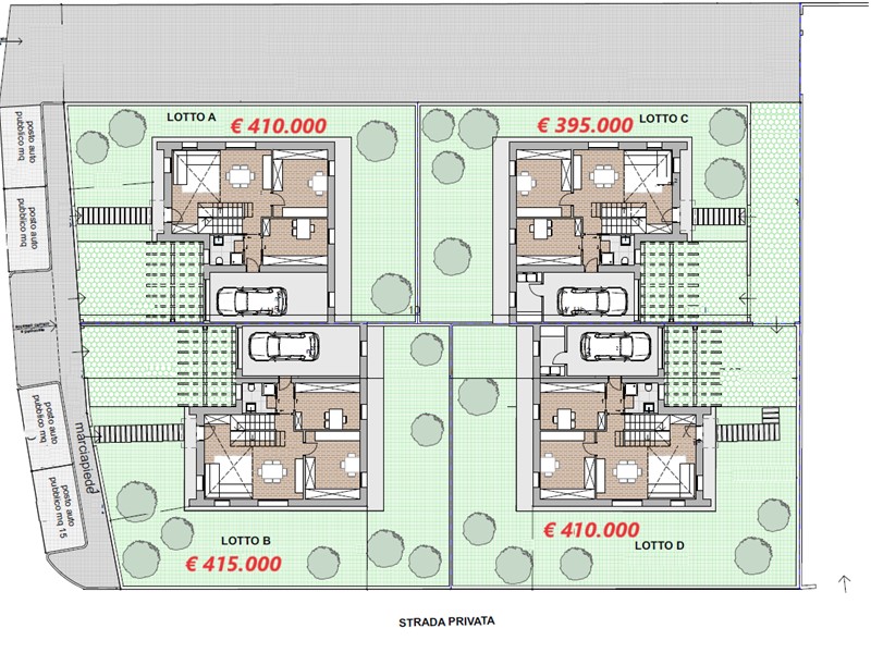 Le ville, libere su tre lati, avranno come confine esclusivamente le autorimesse poste a piano terra.