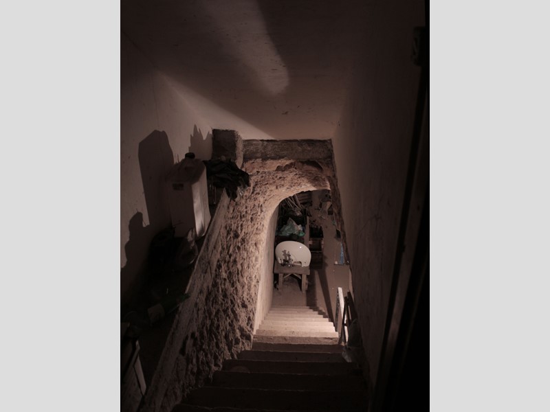 Adiacente alla biblioteca una scala dà accesso al cavedio sotterraneo, che attualmente occupa metà della pianta della palazzina e termina nel giardino dal quale è diviso da una porta. Subito dopo abbiamo una veranda con un locale lavanderia e un wc, dal quale si scende nel giardino, attualmente incolto e con qualche albero da frutta
