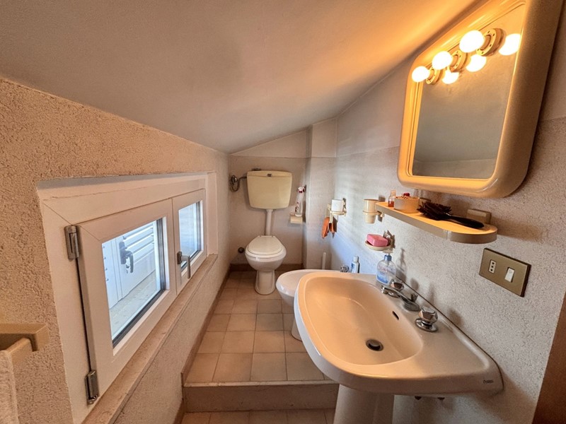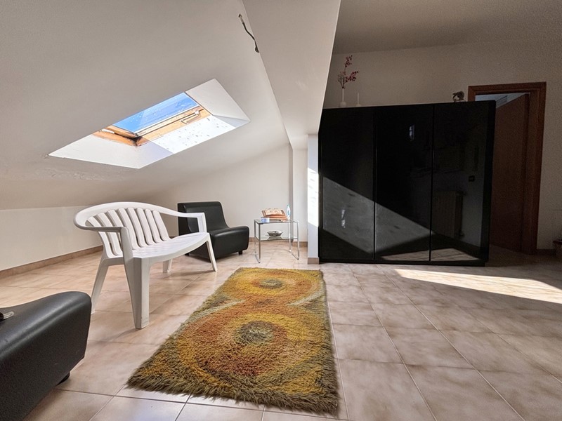 Secondo piano mansardato: camera da letto con bagno privato e zona living/studio.