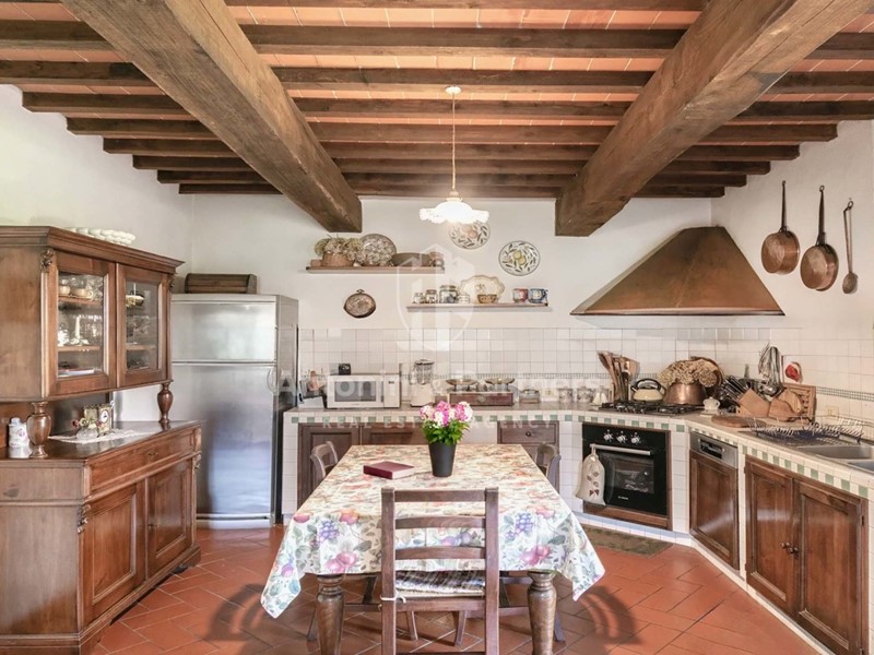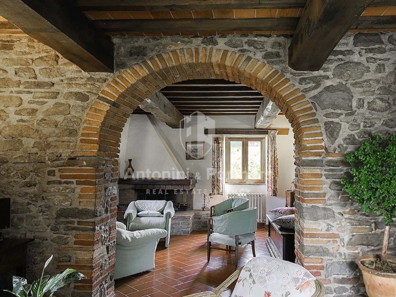 - Il piano terra che ospita la zona giorno e si compone di: cucina abitabile in muratura, sala da pranzo, soggiorno con camino e bagno. Tutti ambienti che si affacciano sul giardino e sono collegati tra di loro da bellissime arcate in pietra.