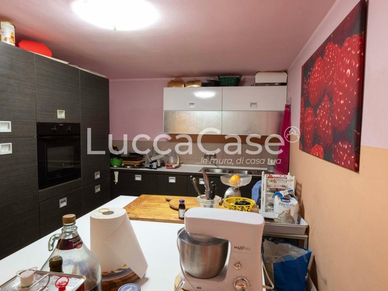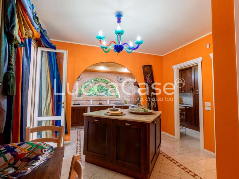 Per accedere alla cucina saliamo due scale, una è collegata direttamente alla sala da pranzo e serve da trait d'union tra i due vani. La cucina, molto ampia è composta da due ambienti, uno operativo e l'altro, abitabile, con accesso alla terrazza attigua attrezzata con un’ampia pergola, un forno a legna e una zona relax per godersi le serate estive.