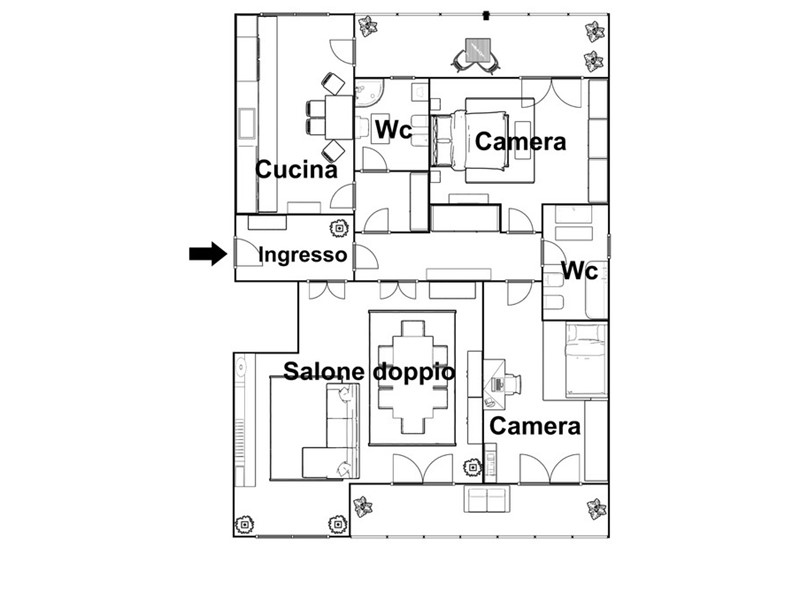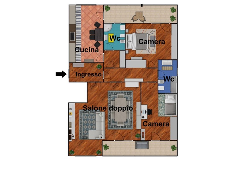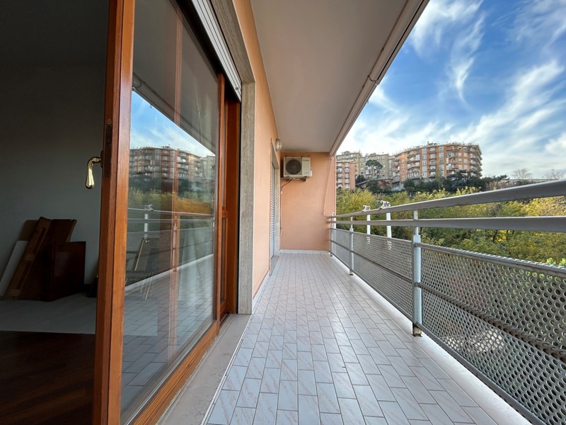 L'unità abitativa, posta al quarto piano con ascensore, vanta ampie balconate con una superficie totale di 23 metri quadrati. La disposizione interna di circa 120 metri quadrati comprende un ingresso accogliente, un ampio salone doppio, due camere da letto, una cucina abitabile e due bagni.